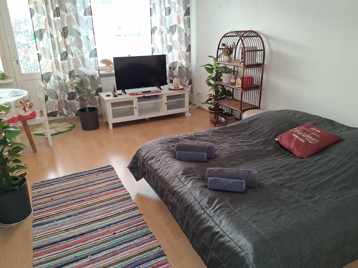 This is a nice, one bedroom clean and comfortable apartment with sauna and balcony! Four people sleeps comfortable on a queen size double bed and sofa bed. In addition, there is also two extra mattresses. Close to the apartment there is a shop and the cultural center of Korundi is a short walk away! You also have a 50 "TV with Chromecast.