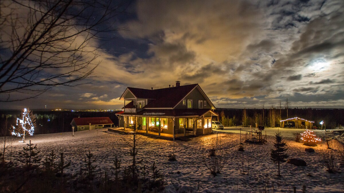 A beautiful area only a 15 min drive from the city centre. Our cozy villa (280m2) is a unique place to spend a holiday near the city, yet in a very peaceful environment, surrounded by the wild nature. You can sit by the bonfire. Whenever the Aurora Borealis appear on the sky, it is easy to see them, because there is no artificial light other than the lights of the our villa. (much better than city centre) I also offer a real Santa Claus visit to my Villa for a small additional fee.