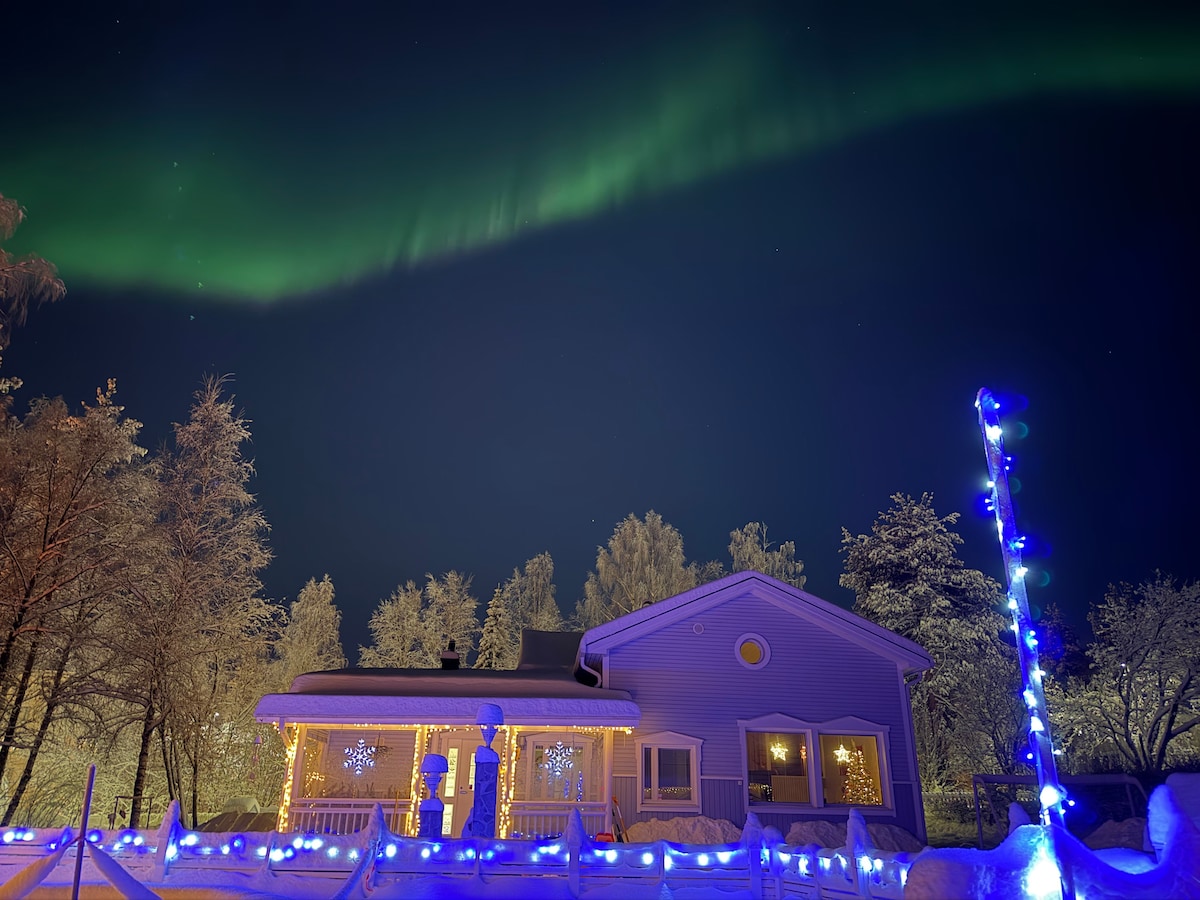 The cabin is located 30 km from the city center of Rovaniemi on the river side of the Kemijoki. Our cabin accommodates six guests and features: - 2x sauna - A fully equipped kitchen - Coffee, tea, hot chocolate, salt, pepper, and olive oil provided - A washing machine and dryer - Electric sauna inside of the house is free to use. The cabin is 30-minute drive from the airport. Thid is a great and peacefull place to spot auroras. Note that the hot tub is available only from May to September