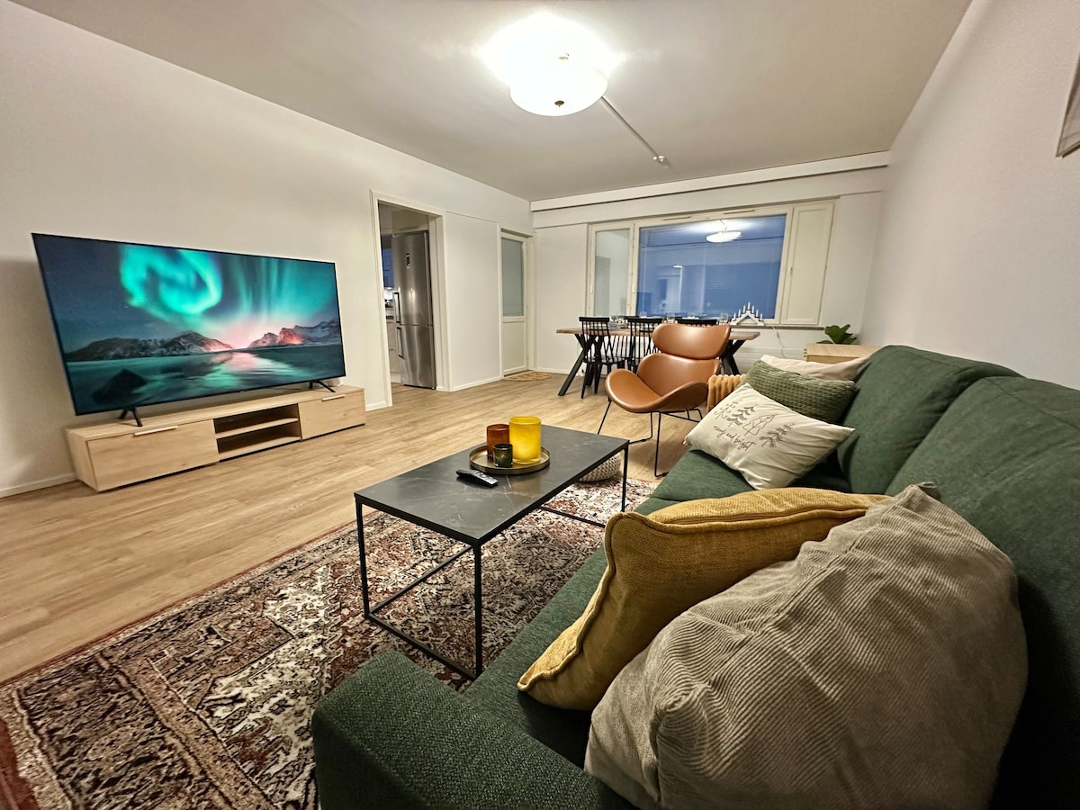 Our apartment is perfectly located near Santa Claus Village, airport and center of the city of Rovaniemi. We offer you beautiful, cozy apartment with two bedrooms (one with on-suite toilet). . You can enjoy our renowated kitchen and make your own dinner and relax in the evenings at living room with fireplace. We also have bathroom with sauna at your use. At backyard you find fire pit where you can grill sausages and if you're lucky,watch the Northern Lights 😊