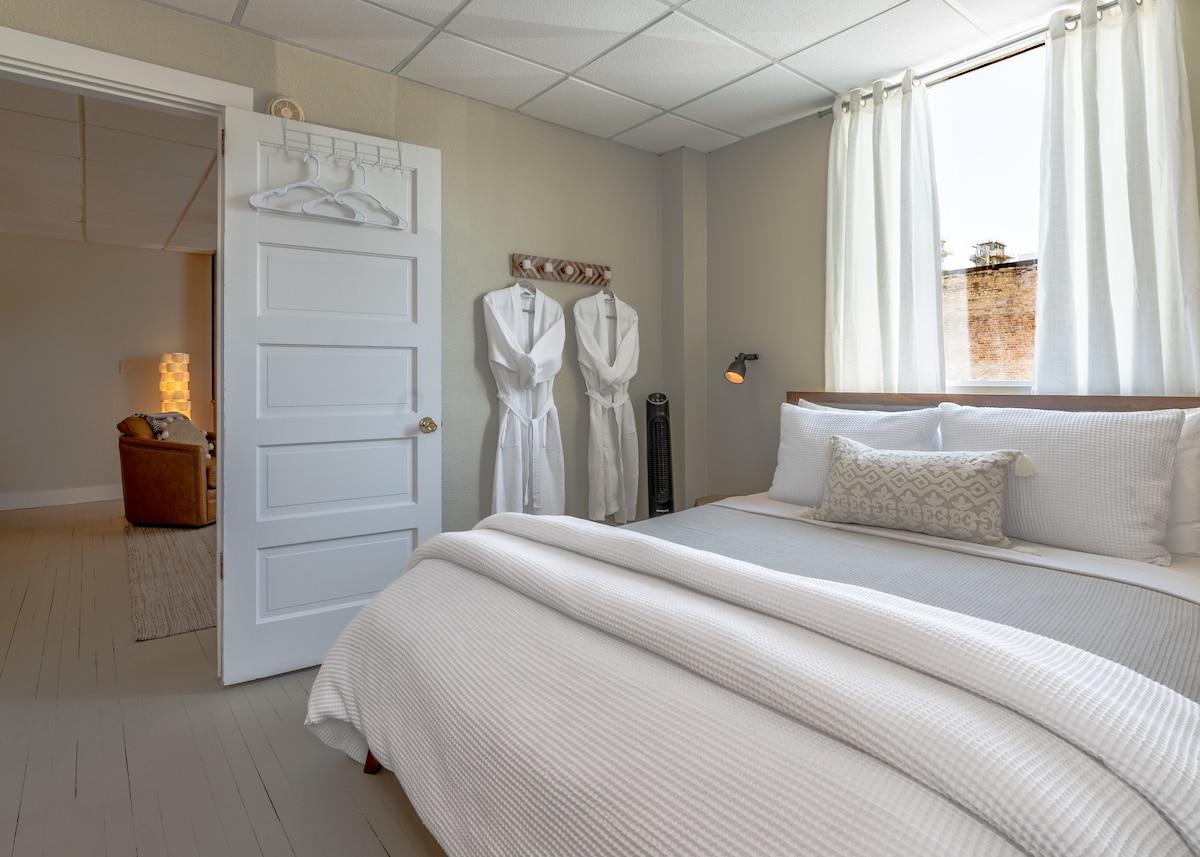 The Lab Loft is an elegant open concept loft with a designer interior, beautiful furnishings, cozy fireplace, 10 ft ceilings, fully outfitted chef's kitchen, huge windows, and spacious bathroom. With the beach just 1 mile away, it's only a 15 minute walk or 5 minute ride on the cruiser bikes we provide to get you to the lakeshore or around town! Plenty of restaurants, coffee shops, boutiques, and breweries all within walking distance from the apartment.