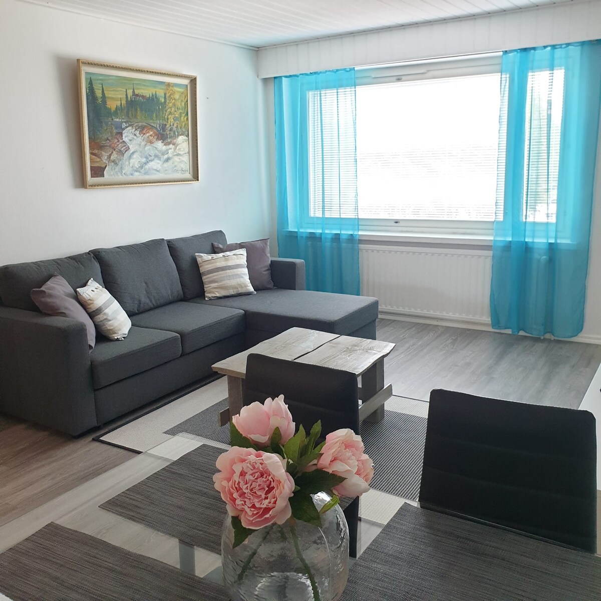 Feel like at home in a well furnished apartment at the city center. Bus/railway station (760 m) and airport (ca. 1 km) are easy to reach. Main shopping center & marketplace 400 meters away. Beds in the bedroom can be separated. Living room has a double sleeper (size=140*200 cm) The short sofa is not suitable for sleeping. Wifi, free parking, fully equipped kitchen, bathroom & sauna, big balcony furnished and cosy to cool off after the sauna add luxury. This is a non-smoking apartment.