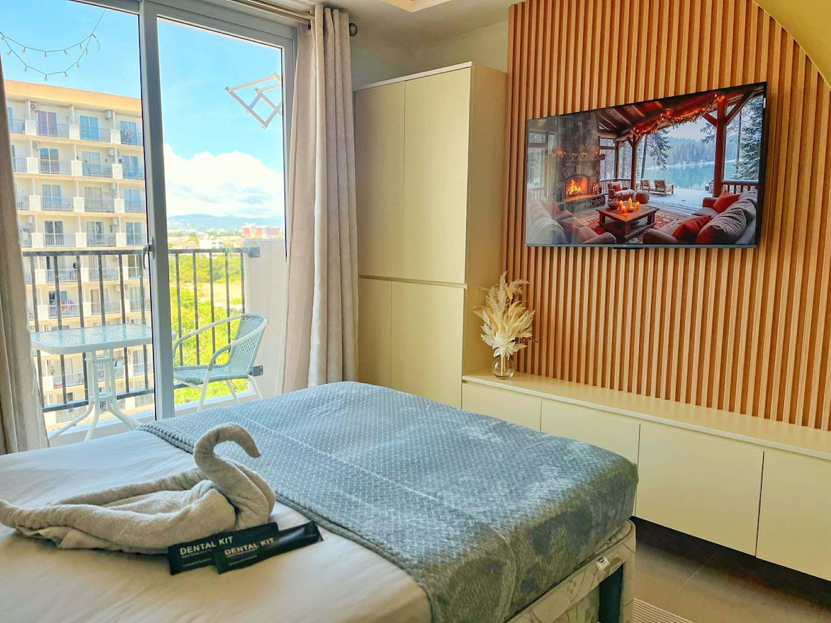 Resort like ambience Korean inspired design Brand New studio type condo with superb amenities. • 12th flr. w/ balcony view of CCLEX, City Skylines, mountain and sea • Double bed w/ pullout hotel like mattress and pillow with protectors lamp shade • Dining Area/Washing Machine • 214 MBPS wifi, TV 50 inches 4K HD signed in Netflix, Disney+ • Kitchen Area with complete cooking wares & appliances • Free use of 2 Olympic size Swimming Pool and a Kiddie pool • Smart Lock Check-in • Elevator