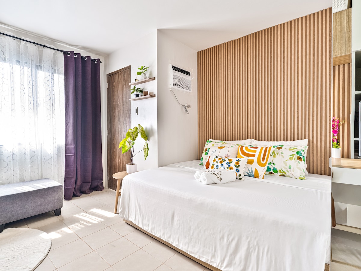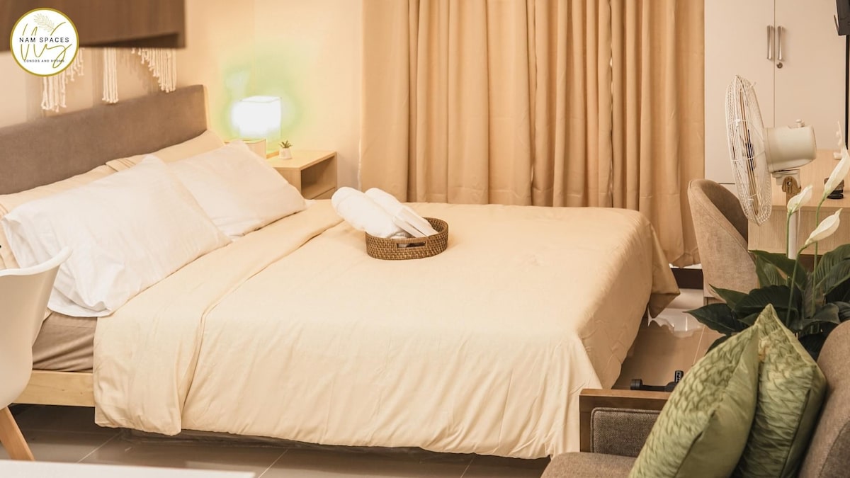 Comfy, accessible, and aesthetic condo studio unit near Mactan Cebu International Airport 24 sqm condo unit with balcony Oceanview with Queen-sized bed • can fit 4-6 pax • extra foam mattress and extra blanket provided • free pool access for 2, paid parking inside Bathroom with: • shower, heater, bidet • shampoo | conditioner | body gel provided • towels Entertainment • 200 mbps internet connection • 1080p 4K Smart Projector with surround sound • Mini karaoke • Card and board games