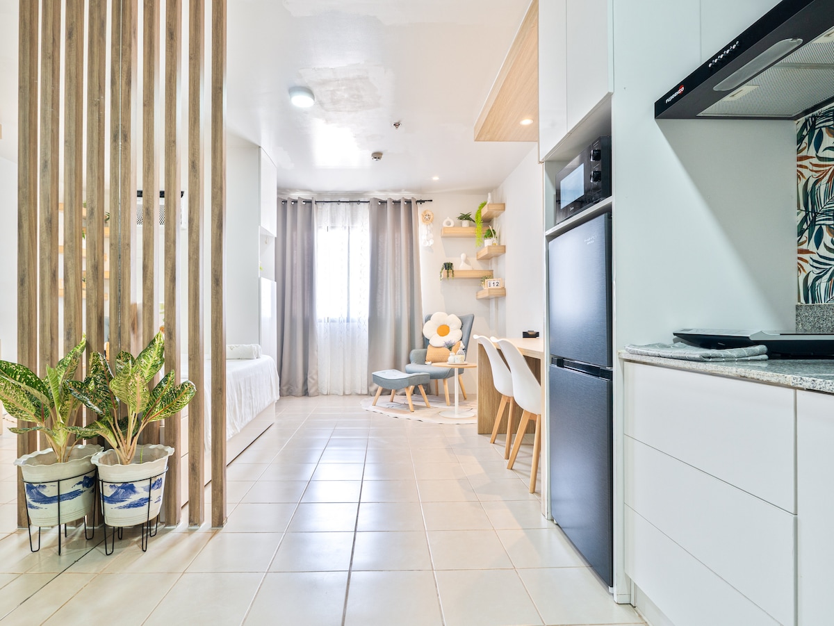 Kick back and relax in this calm, stylish studio unit near Mactan-Cebu International Airport! Inclusions: - Free access to the Pool and Gym - Towels and toiletries - Complimentary Coffee - Hairdryer - Clothes iron - Extra bed linens (upon request) - Wi-Fi About our space: - Pet-friendly - 32 sqm with a balcony facing the pool - Queen-sized bed with 2 bedside outlets - Work desk - Hot and cold shower - Dining area - Smart TV with Netflix - Wardrobe - Kitchen - Washing Machine