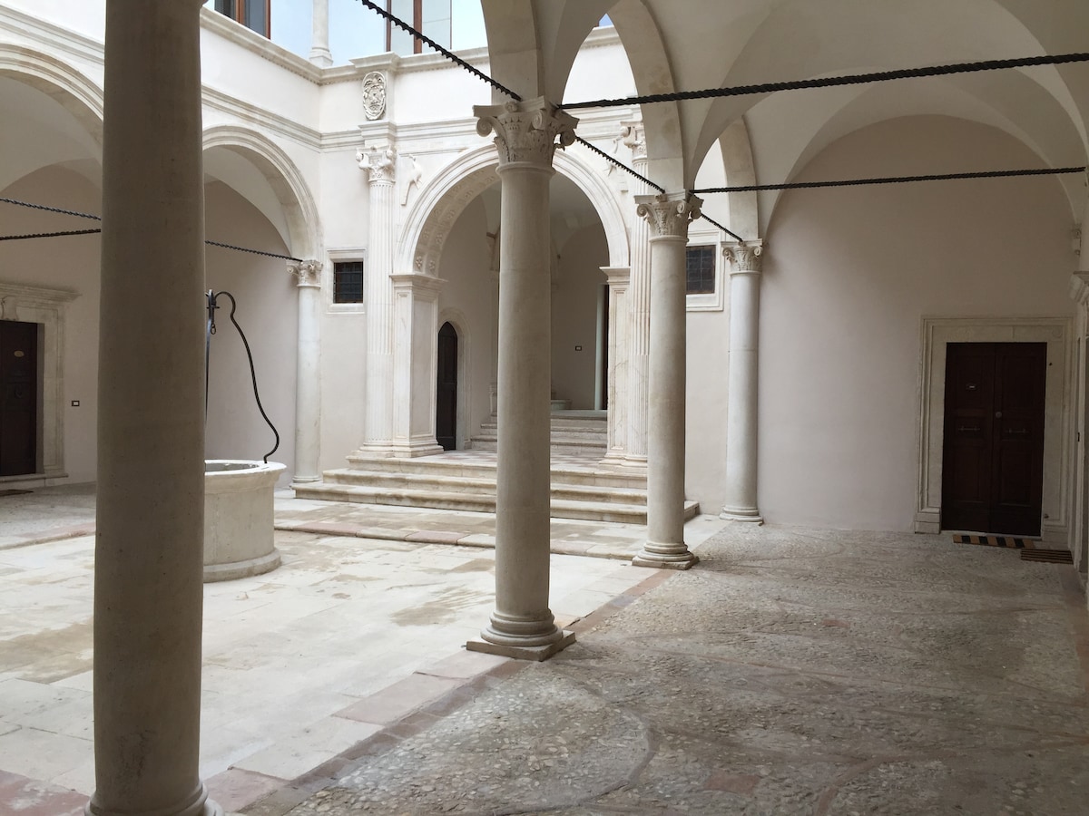 Give yourself the privilege of staying in an accommodation with a large private courtyard in the heart of the historic center of L'Aquila, in one of the quietest streets of the city (no pubs, bars and shops), in an intimate and elegant setting, near Piazza San Pietro, one of the most characteristic views of the historic center, characterized by the thirteenth-century church. Building bound to the Fine Arts refurbished with the most advanced anti-seismic techniques. 60sqm apartment.