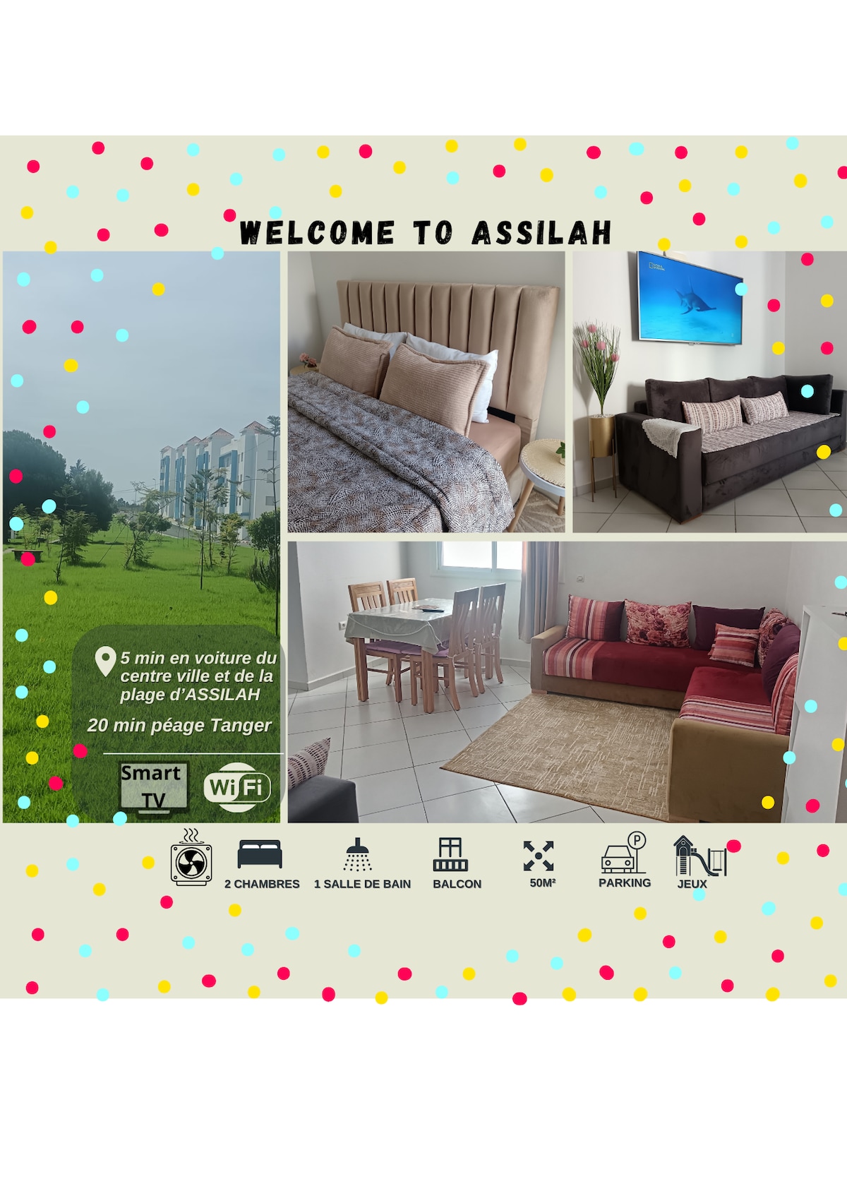 a quiet and de-stressing place with a touch of nature, Welcome to our 2 bedroom aprt in assilah : - in 2d floor,500 m from highway A5, 5 min to the center and beach, - tow pools, -watch your children in the pool from the balcony; - mobile wifi routeur;android TV 55, -2 spacious rooms + 3 beds one for baby; - fully equipped kitchen with electric stove; - can host up to 6 guests + 1 bed for baby; - 24/7 security+ free parking; - grocery store inside -maintained garden - children's play area