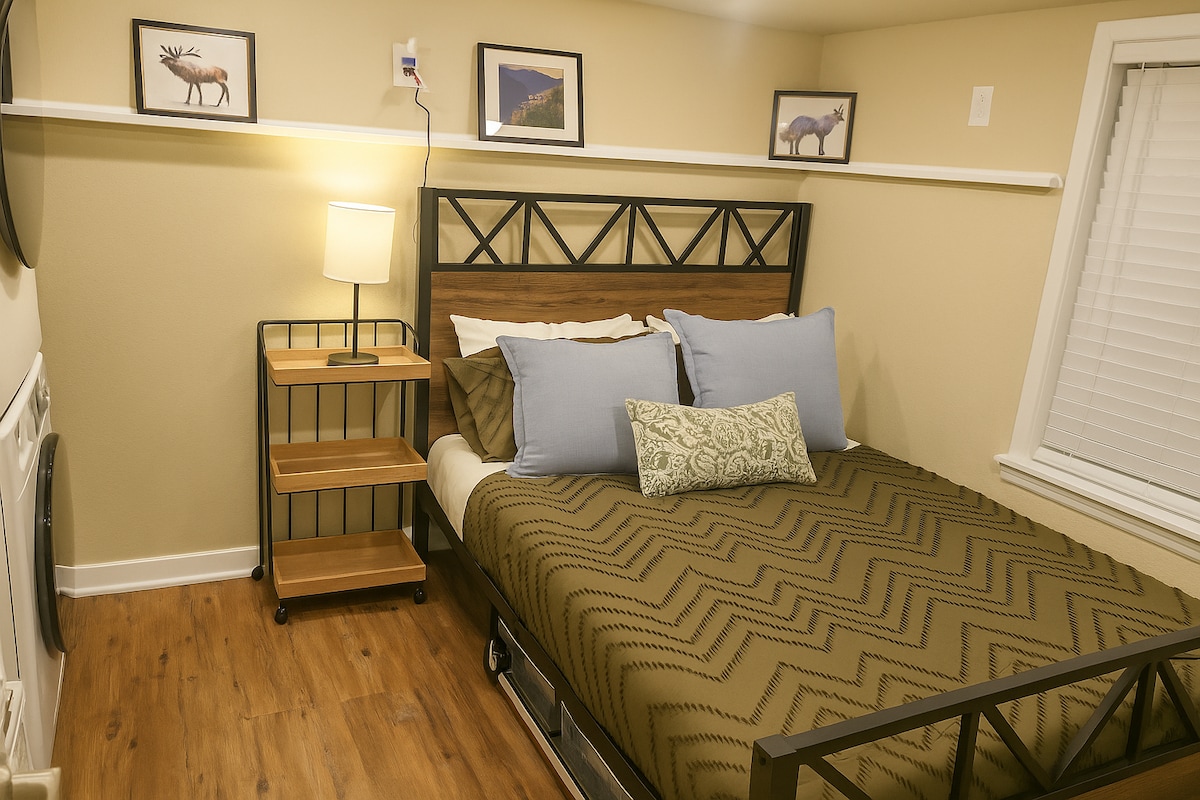 🐾 Cozy Western horsebox getaway! 1 queen bed, compost charming, attached outhouse/ camp port-a-potty, outdoor kitchen 🍳, hot outdoor shower 🚿! ✨ Rare! 2 pets stay free (more w/ approval, $10 each) 2 mi off I-25, 10 min to town, stores/dining 20%+ off longer stays! ❓ Guesthouse access *usually available* Social spot w/ 🛁 bath, 🚻 half-bath & kitchen. If this is a potential dealbreaker, ask via message. Games, firepits, horses, chickens & bees. Dirt roads & secret labyrinth to explore!