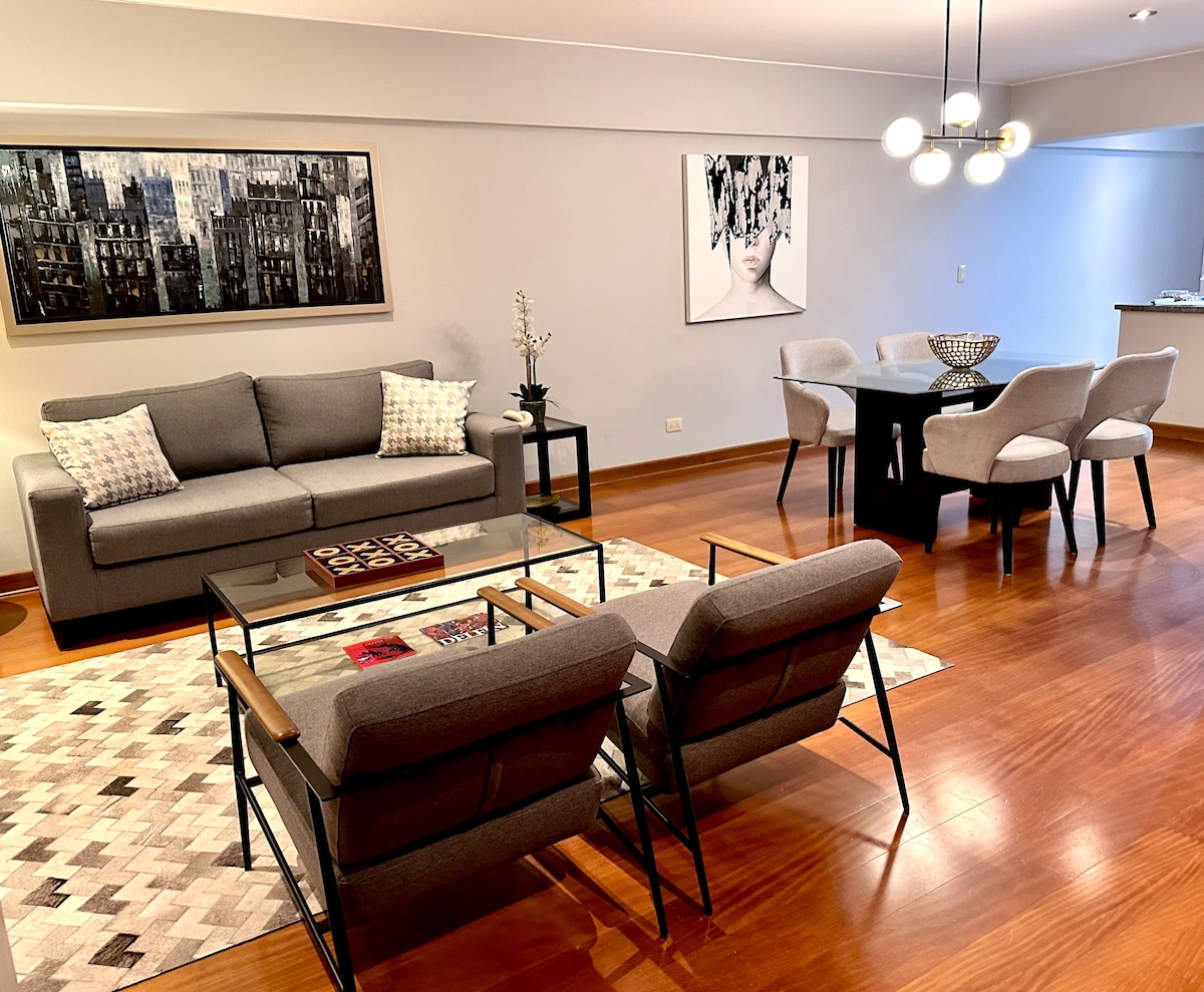 Entire Apartment next to the Hilton. Lovely view. Prime location in the heart of the Miraflores, nothing can beat this rental! Everything is within walking distance: Supermarket, Kennedy Park, Larcomar, Boardwalk & cliffs, Artisan Markets, Beach, Parks, Plenty of tourist attractions and the best Upscale Peruvian restaurants. This is the place to stay! Ideal for tourists and executives looking for high end accommodation. The apartment has reliable WIFI & Smart TVs. Experienced Super Host.