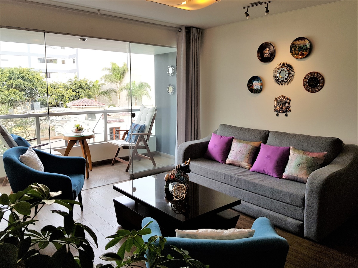 THE BEST LOCATION, ELEGANT DECORATION Barranco/ Miraflores, a few steps from San Isidro, Chorrillos, Costa Verde Beaches. 1 bedroom -Queen bed 1 full bathroom Living room - double sofa bed 2 flat screen TVs -Bedroom and living room 3 burner stove -3 burners Equipped open kitchen Microwave oven Refrigerator Washer-dryer Electric water heater Air conditioner Balcony Outside parking - Common areas: Swimming pool Jacuzzi Gym Grill Lounge Game Room Bar room, giant TV Laundry