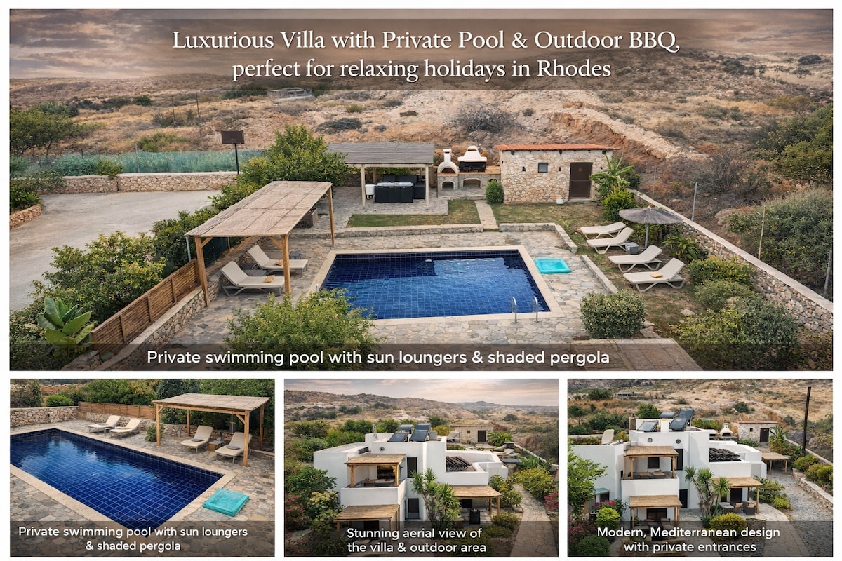 Celeste Luxury Villas is a premium complex in Lardos, Rhodes, featuring Thea and Avra Luxury Villas. Each villa hosts up to six guests with three elegant bedrooms, two modern bathrooms, a fully equipped kitchen, and a stylish living area. Outdoors, a private pool, sun loungers, a dining area, and a lush garden offer ultimate relaxation with an amazing seaview. Just minutes from shops and the beach, these villas combine luxury, privacy, and convenience for an unforgettable Mediterranean getaway!