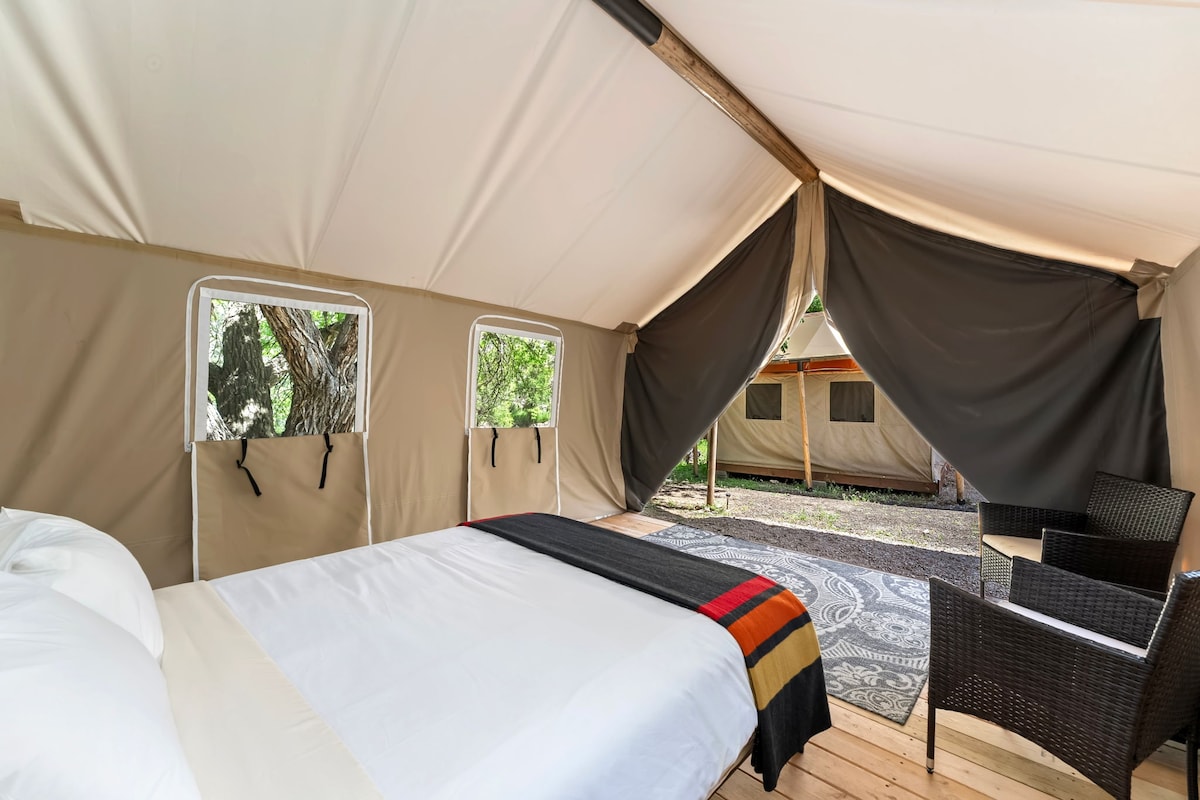 Cache La Poudre River Experience at the Glen Echo Resort. Reconnect with nature at this unforgettable escape. Hear the river just outside your door. Have the ultimate glamping adventure in a luxury tent on the Cache La Poudre River! Whether you're planning a romantic weekend, seeking a unique adventure, or simply yearning for a peaceful escape, this tent provides the adventure of tenting and the comfort of a queen bed. Watch the water go by from your tent or at the fire pit outside.