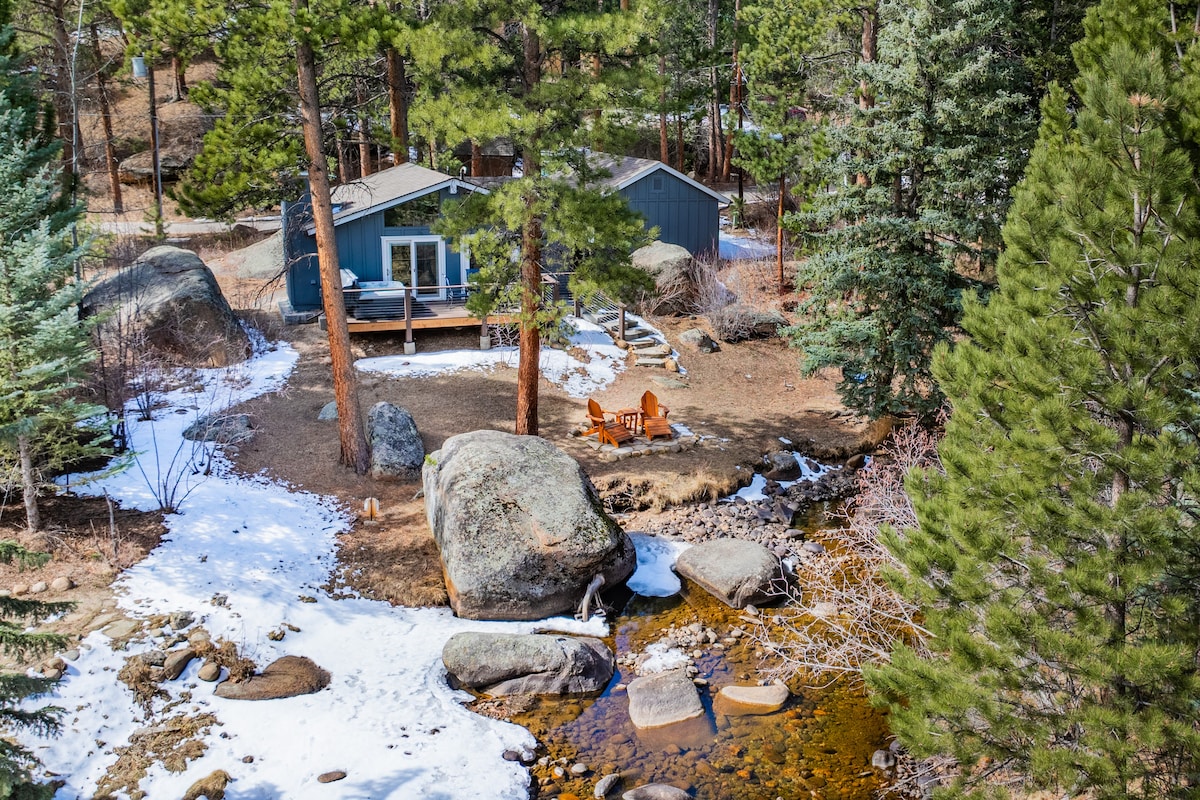 Fall asleep to the soothing sounds of Stillwater, a peaceful cabin with a hot tub on the bank of Fall River (Permit 3068). BBQ on the deck, read by the water's edge, enjoy the gas fireplace & reconnect with nature's tranquility. A place to rejuvenate! - 2 mins to downtown Estes Park - 5 mins to RMNP - Private riverside hot tub - Cozy gas fireplace - Comfortable king bed - Riverside seating area - Smart TVs - Full kitchen Serene cabin for 4, freshly remodeled for maximum relaxation