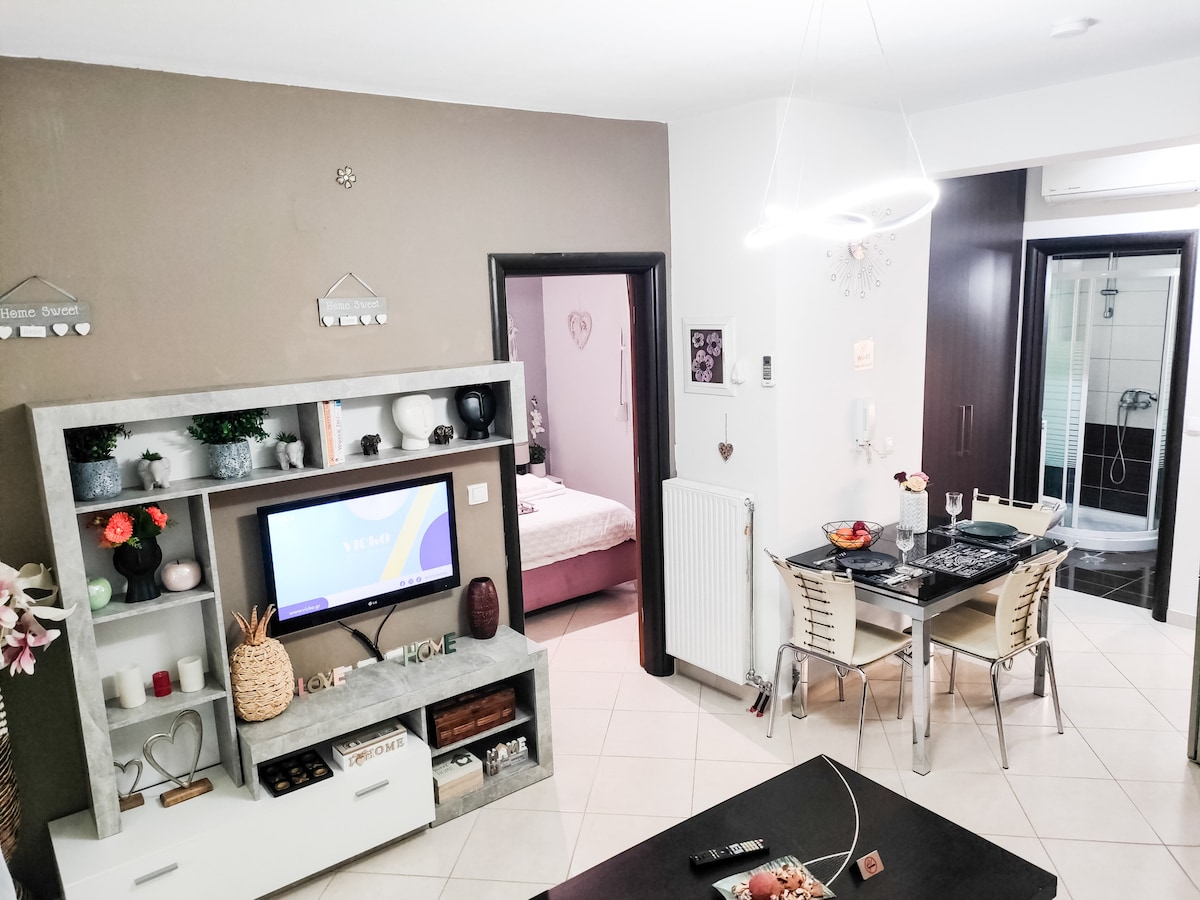 Ένα διαμέρισμα πλήρως ανακαινισμένο και διακοσμημένο, σχεδόν απέναντι από την Κεντρική πλατεία. Αποτελείται από ένα άνετο κρεβάτι queen size, μία μικρή κουζίνα , ξεχωριστό living room και ευρύχωρο μπάνιο. Βρίσκεται σε πεζόδρομο ήπιας κυκλοφορίας, μια ανάσα από τα καταστήματα για ψώνια, τα εστιατόρια και τα μπαρ. Υπάρχουν δύο τηλεοράσεις ,NETFLIX και κλιματισμός Δωρεάν wifi Μπαλκόνι Εξοπλισμένη κουζίνα και καφετέρια nespresso Υπάρχει ιδιωτικό παρκινγκ σχεδόν απέναντι με ειδική χαμηλή χρέωση