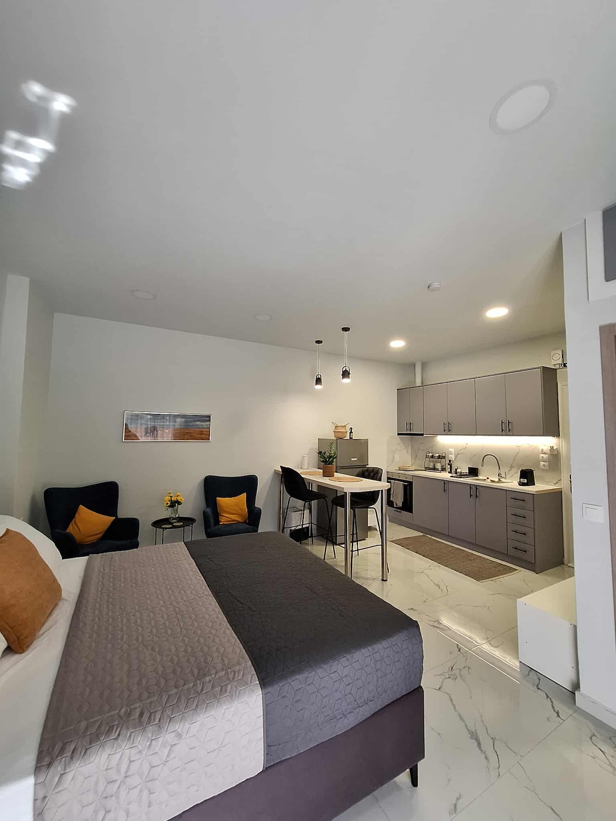 A stylish luxury rooftop apartment offering comfort, privacy and a premium city-living experience. The furnished rooftop balcony is perfect for relaxing, enjoying your coffee or working remotely. The modern open-plan interior is fully equipped and ideal for couples and business travelers. Located in a central area with easy public parking right outside the property. Amenities: ✅️Fully equipped kitchen ✅️comfortable bed ✅️fast Wi-Fi ✅️Smart TV ✅️ Netflix ✅️air conditioning