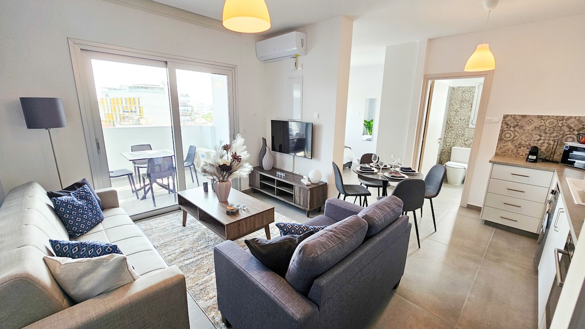 Welcome to our Chic & Modern 1-Bedroom Apartment! This brand-new, tastefully designed apartment offers a cozy and elegant home away from home in a quiet neighborhood, just minutes drive from downtown Larnaca and within walking distance to the beach. Enjoy the comfort of a stylish living area and unwind on the private balcony with lovely side views of the sea - perfect for a morning coffee or a relaxing evening. Ideal for both short getaways and extended stays.