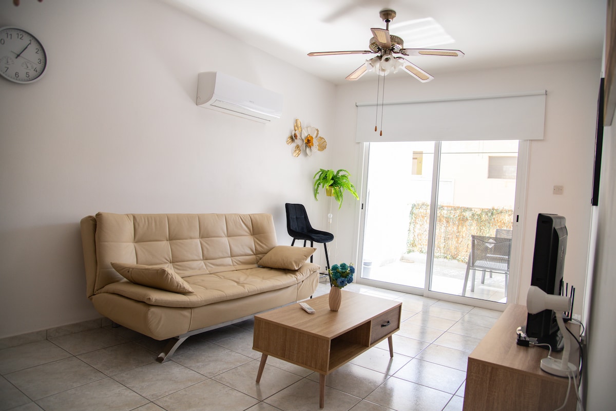 This cozy 1 bedroom apartment is a short walk from Finikoudes beach and Larnaca city center, lovely park and playground nearby , Supermarkets, shops, cafes, restaurants, clubs, museums and historical sites are all within walking distance and other parts of Larnaca are reachable by the public transport nearby. Ideal for couples, friends, families and solo travelers. Just 15 minutes by bus from the Airport