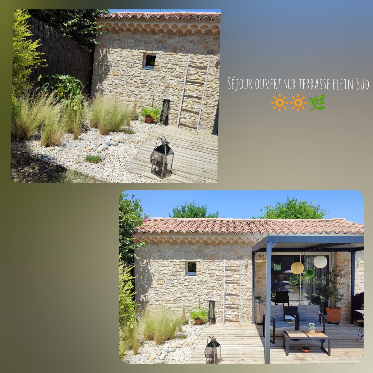 Confortable logement de 60m2 dans un mas typique en pierres du 18ème au milieu des vignes. Accès, terrasse et parking indépendants . Sur la commune de Saint-Montan (village de caractère). Logement: 1 chambre : lit en 160, bureau et dressing. Pièce de vie: salon canapé clic-clac, tv et wifi cuisine équipée (four, lave vaisselle, nespresso, induction..) Très grande salle de bain avec lave linge, baignoire, douche, 2 vasques. Matériel bébé (chaise haute, lit bb) et livres enfants.