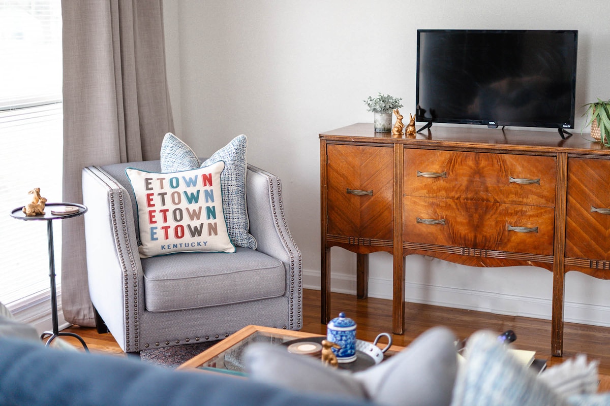 ⭐️NEWLY REMODELED ⭐️ KING BED, QUEEN, FULL, and REMOTE TILT TWIN. TWO LIVING ROOMS. ⭐️FREE PARKING⭐️ 3 FULL BATHS. LARGE HOME. The whole group will enjoy easy access to everything from this centrally located place. 1.3 mile from E-town Sports Park Gates Park across the street 1.2 mile from down town 4 bedroom 3 bath 2 living rooms 1/2 acre 2300 sf peaceful 1.5 mile away from 65 or Western Kentucky Parkway. CLOSE TO HODGENVILLE, FORT KNOX, GLENDALE, VINE GROVE, 45 min LOUISVILLE