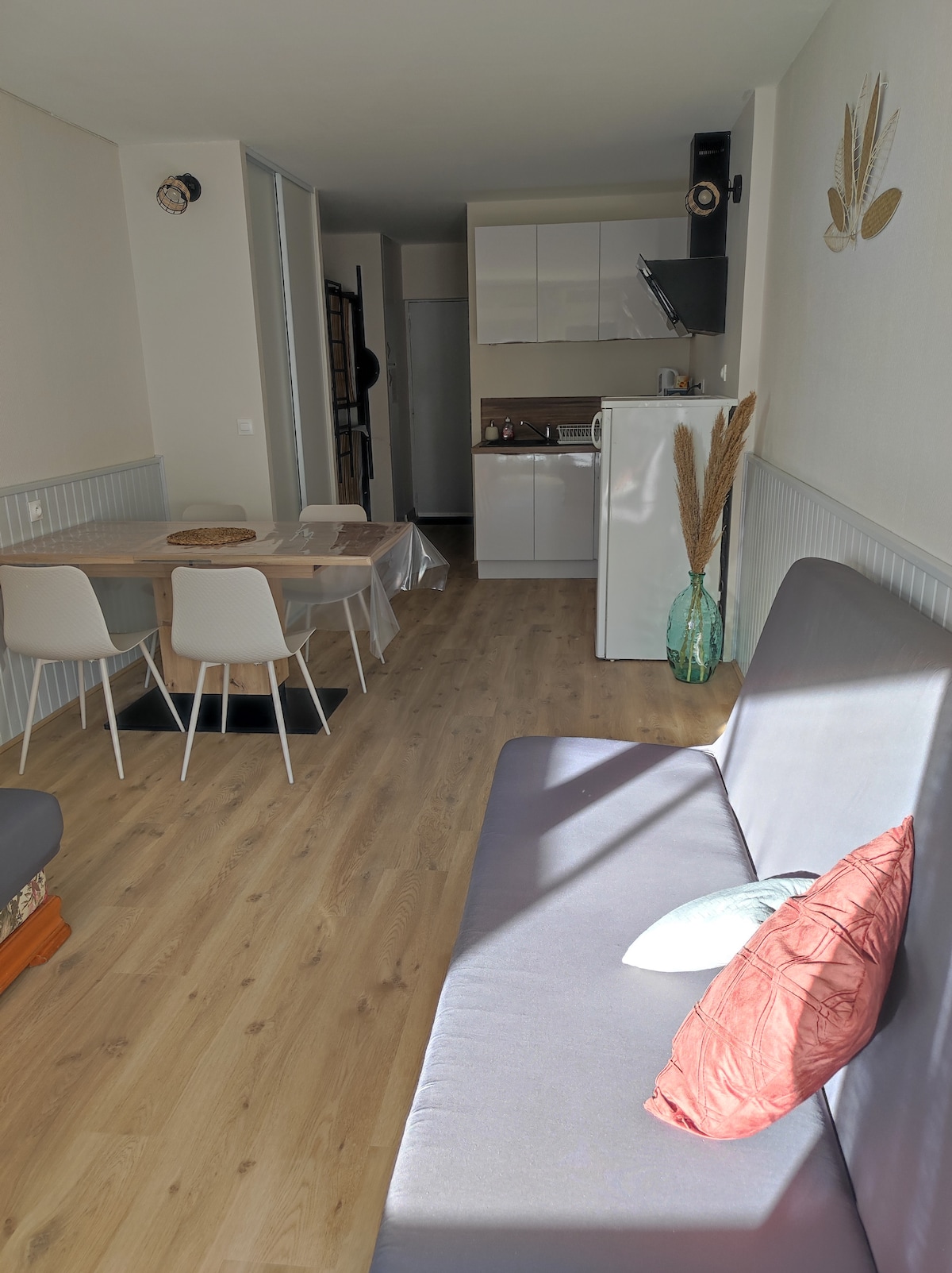 Appartement 100% cocooning, situé au deuxième étage d’une petite résidence. Emplacement calme tout en étant situé au coeur du village, avec un grand parking non privé. Un nid douillet de 35 m2 pour 4 personnes, chaleureux et raffiné. 100 m2 de terrasse et jardin privatif. Couchage: 1 chambre avec un lit en 140x190 et un grand dressing, Canapé lit avec un véritable matelas en 140x190 Lits faits à l’arrivée. Cuisine toute équipée. Salle de bain avec douche, WC indépendant. Draps de bain fournis.