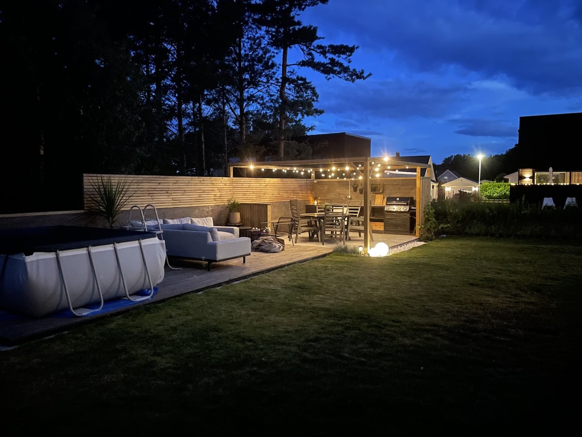 Ledig for utleie i uke 28 og uke 29. * Nyoppusset i 2020 * Flott og stor hage med flere soner, samt trampoline * Ca 130 kvm stor terrasse, inkl svømmebasseng * Meget barnevennlig i liten trafikkert gate * 5 soverom, med 12 sengeplasser * 2 bad * Stilrent kjøkken med alle fasiliteter. Stort spisebord med plass til 12-14 stk * Passer fint til 2-3 familier * Sol fra morgen til kveld * Garasje med elbil-lader, pluss stor gårdsplass til flere biler *