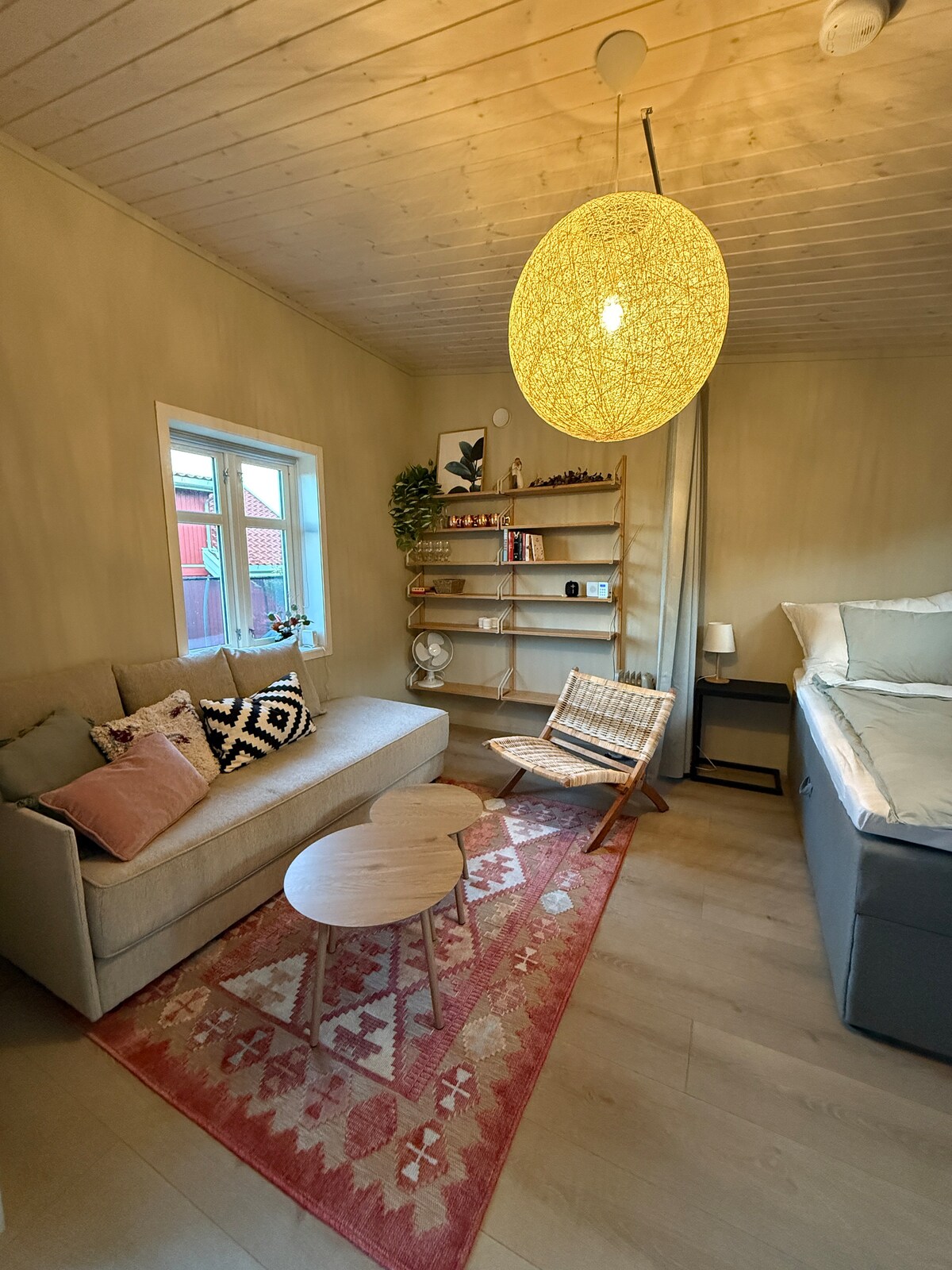 Lite hus bestående av kombinert oppholds/soverom og kjøkken. 2 senger 75x200 + sovesofa 120x200 Spisebord +salongbord Sengetøy og håndklær Fullt utstyrt kjøkken Entre,bad og toalett. På sommeren kan annekset benyttes, 2 senger + sofagruppe. Uteplass med platting og hage. Sentralt ,kort vei til sjø og strand ,fine turområder Dagligvare,kafe,bakeri rett i nærheten. Kort vei til jernbane og Color Line. Busstopp rett nærheten. Flatskjerm ,gratis WiFi