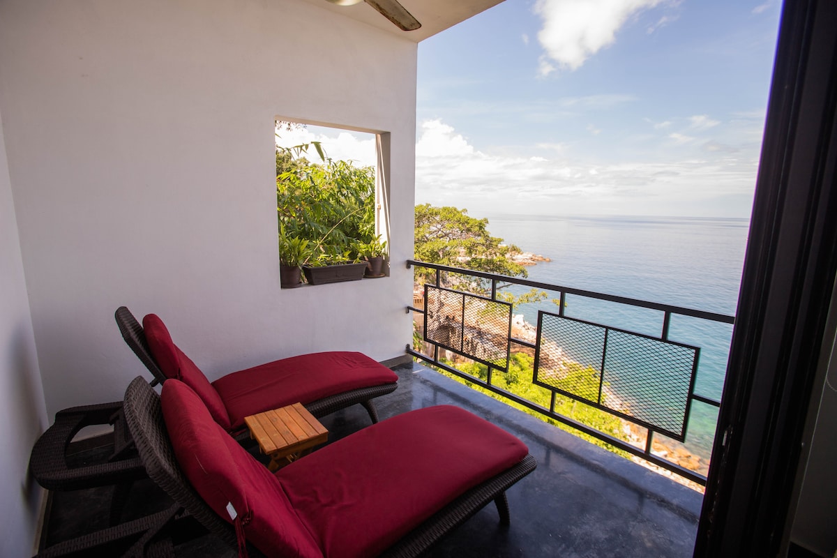 Estudio amplio, con la mejor vista de la bahía, de atmósfera relajante y natural, ubicado en una comunidad tranquila a solo 5 minutos de las más hermosas playas como Mismaloya, Palmares, Las gemelas, Colomitos, Quimixto, Yelapa las animas etc. ruta de camiones pasa frente de la casa para ir a cualquier punto de Vallarta, cocina amplia con refri, aire ac. y ventilador, un pequeño armario, hielera, sombrillas y kayak, si te gusta la pesca puedes pescar de orilla en la playa justo abajo el estudio.