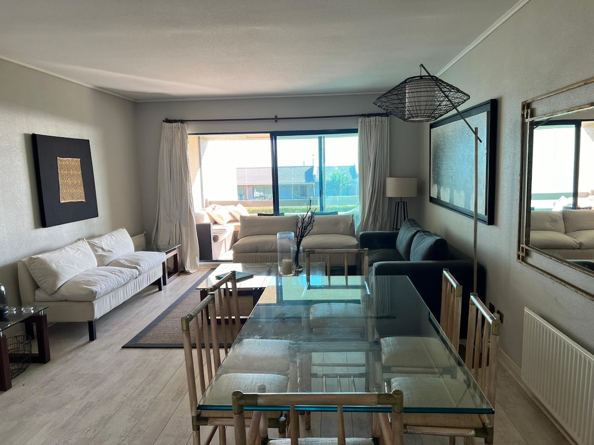 Cómodo y acogedor departamento en 1er piso con patio y salida directa al parque y vista al hoyo 1 de la cancha norte de golf. cercano a club house, canchas de tenis, padel y cancha de golf. Completamente equipado con cocina americana, horno, microondas, lavavajillas, lavadora/secadora, WiFi, Smart TV, calefacción. Terraza cerrada con termopanel. Sofá cama 2 plazas en el living, con posibilidad de alojar a invitado adicional. 2 estacionamientos exclusivos + 8 de visita del edificio.