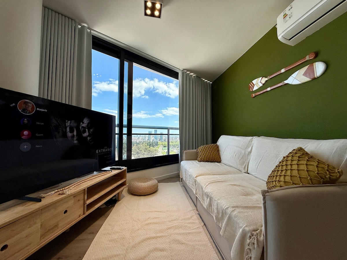 Spacious studio apartment in a new designer building, with parking, full-equiped kitchen, fast Wi-Fi, living room with 50´ Smart TV with DirecTV, balcony with a beautiful clear view of the city skyline, washing machine, double bed, spacious bathroom. The building is very nice and has a gym and free garage for your use. The location is the best in the city (Golf), green, peaceful, safe and close to everything (Punta Carretas Shopping, Parque Rodó, Ciudad Vieja, Rambla, beach).