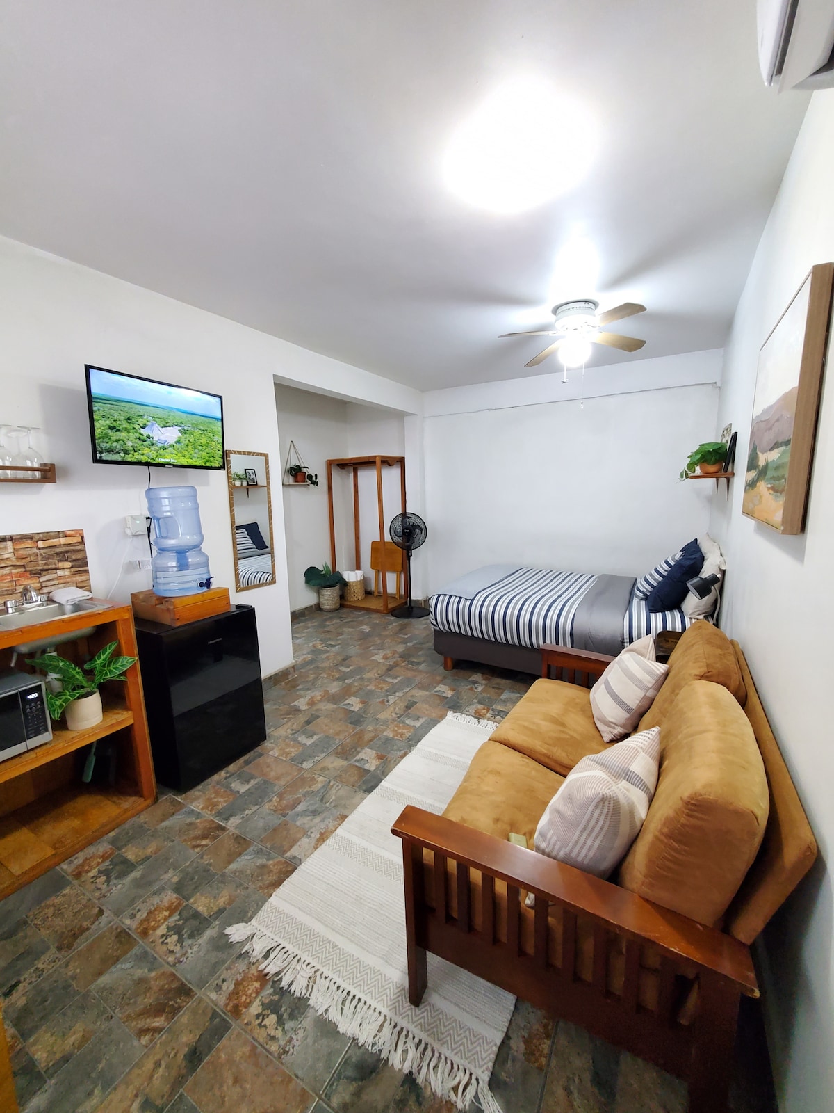 Welcome to our luxury and comfortable studio, designed to provide 5-star experiences for couples. With a King size bed, rain waterfall shower with perfect pressure and temperature, high-speed Wi-Fi, complementary coffee service, sofa-bed for kids, premium finishes and rotating TV, this studio is better than any hotel room or suite. This is a new unit that was finished in October of 2023, with everything out-of-the-box brand new. The stay includes private gated parking. Located at Casas Sanblu.