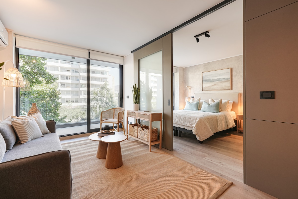 Beautiful and comfortable studio apartment steps away from Parque Arauco and Clínica Alemana. Enjoy a cozy and comfortable stay in Las Condes. Our Hosts are 1 click away! -Surrounded by cafes, restaurants and luxury shops -Comfortable King bed and 2-seater sofa bed -Kitchen fully equiped -High speed internet -Outdoor and indoor heated pool -Gym -Security and controlled access Ideal for: Business or pleasure People looking for a safe and quiet location