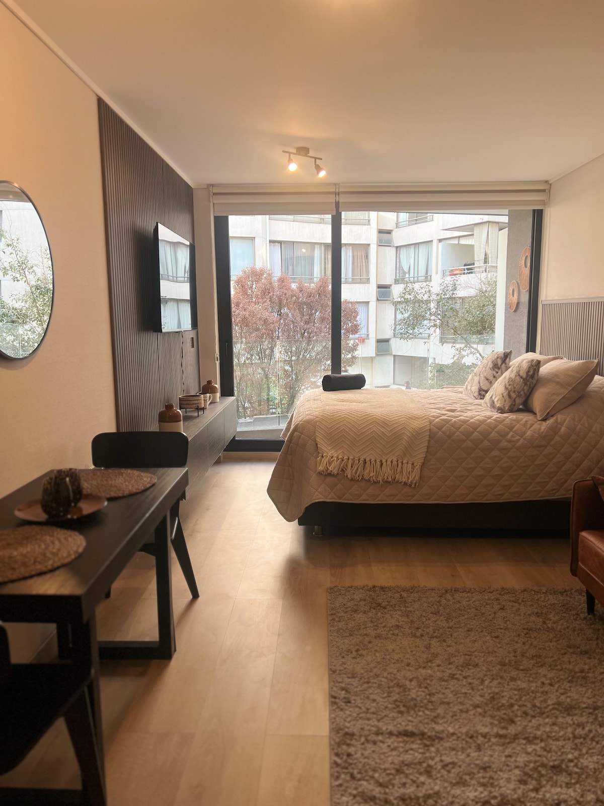 Disfruta de este acogedor departamento de 45 m2, tranquilo y céntrico en el mejor sector de Las Condes. 1 dormitorio con baño en suite, cocina amplia, living comedor, home office y linda terraza con malla de seguridad. Con una cama de dos plazas y un cómodo sofá cama. Cocina completamente equipada con lavadora. Estacionamiento subterráneo gratuito. Además el living con smart tv de 50” con tvcable, internet de 500 mbps, netflix. Locales comerciales, restaurantes, metro y malls a un solo paso.