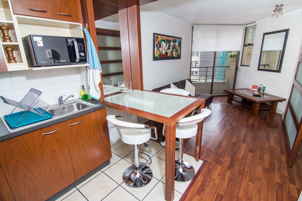 Moderno y acogedor departamento con aire acondicionado en el corazón de Santiago. A pasos del metro y del Centro Histórico, rodeado de museos, mercados y restaurantes. Cama king, cocina equipada, balcón y wifi rápido, ideal para viajes o estadías largas. Edificio seguro con conserje 24/7. Atención personalizada, check-in flexible y recomendaciones locales para que disfrutes la ciudad como un residente, con comodidad y tranquilidad.
