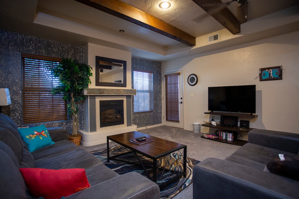 This southwestern styled two bed/two bath condo is located within walking distance to the heart of historic Old Mesilla. With a King Bed in Master bedroom and queen size sofa in second room. With an outdoor balcony and a fully equipped kitchen. There is a fitness center and swimming pool. Feel safe and secure in this gated complex. Apartments are steam cleaned between guests.
