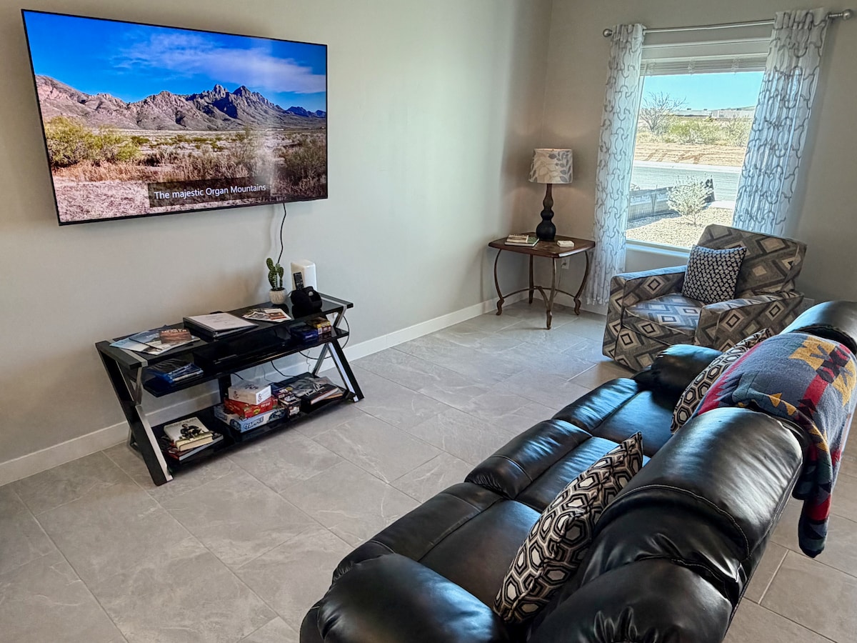 Pecan Palace: luxe 4-BR near NMSU & White Sands. Tucked by pecan farms, this new retreat blends comfort + fun. Perfect for families, work trips, extended stays. ☞ EV charger ☞ Backyard hot tub under pergola ☞ Climate-controlled game lounge with pool table ☞ Foosball ☞ Poker ☞ Pac-Man ☞ Fully equipped chef's kitchen ☞ Plush bedrooms with blackout curtains ☞ Prime spot—1.5 mi to NMSU, Interstate I-10, dining & shopping ☞ Easy access to White Sands NP and downtown