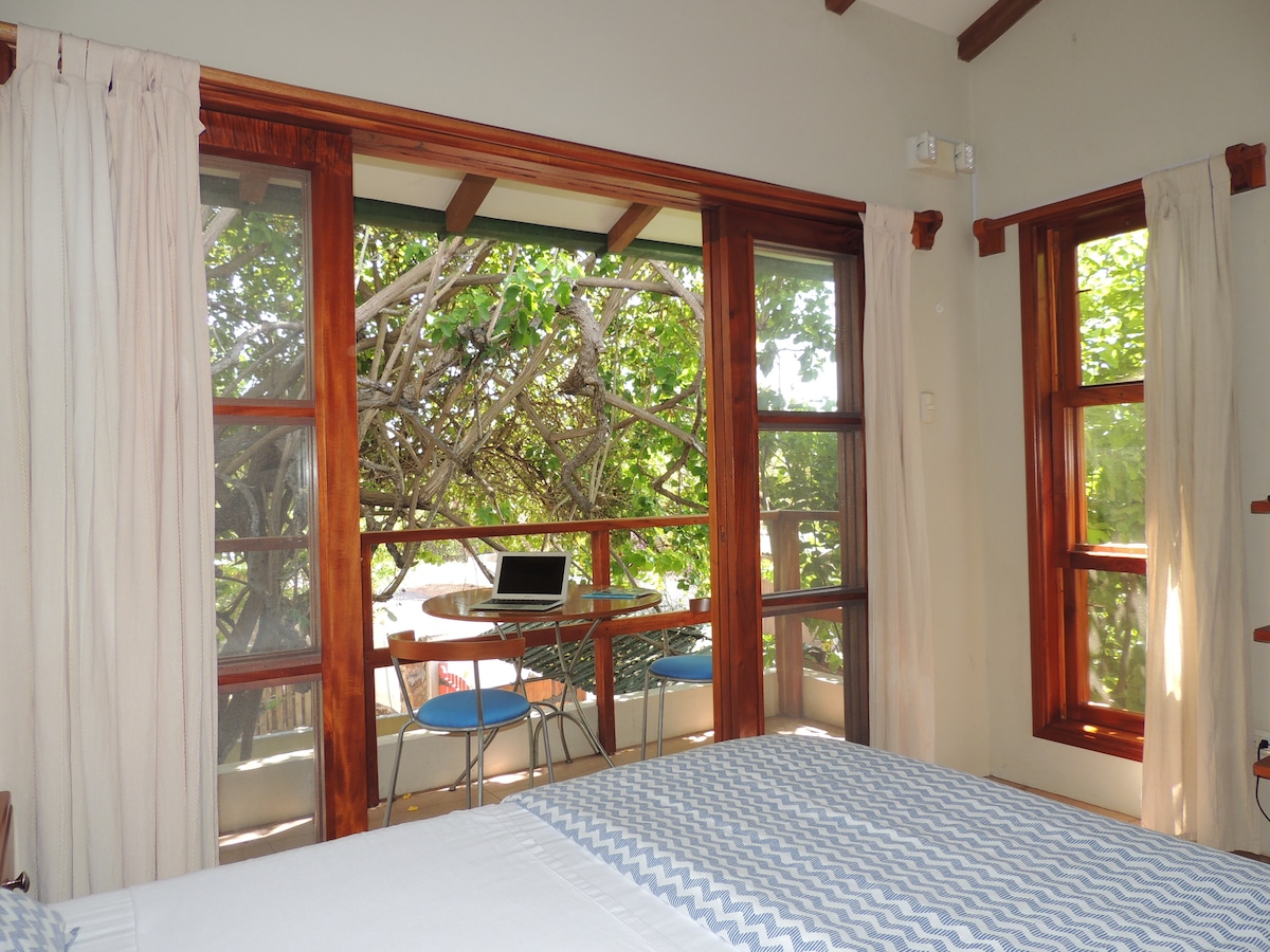 Sunshine filled, bright garden suite, next to the entrance to the Galapagos National Park and the Charles Darwin Station, and a few blocks away from some of the best restaurants, art galleries and bars in town. Located on the far end of one of Puerto Ayora's main streets, accessible to the road but removed enough to be isolated from the urban noise. An AC cools the suite when needed in the warmer months, and it’s screened windows are the alternative as well .