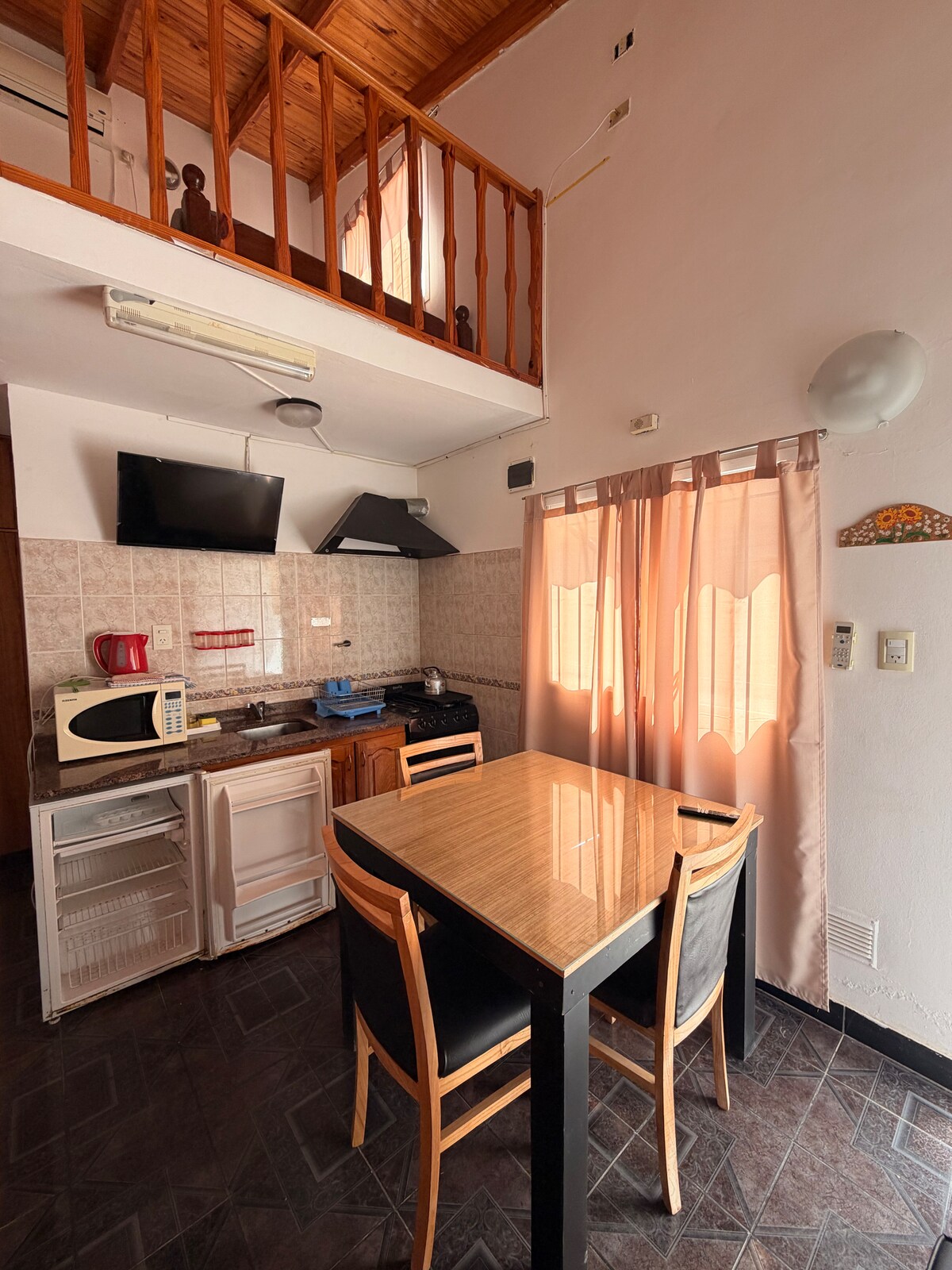 Abigail departamentos Departamento céntrico monoambiente ideal para 2 personas y un menor(chico). Se encuentra a metros de la peatonal y la playa. El departamento tiene escaleras las cuales llevan a la habitación con aire acondicionado , y en la parte de abajo cuenta con un sofá cama pequeño y una cocina equipada. Tiene una salida a la terraza, con vistas a la playa y a la peatonal del centro. Por otro lado tiene una parrilla compartida. No cuenta con estacionamiento!
