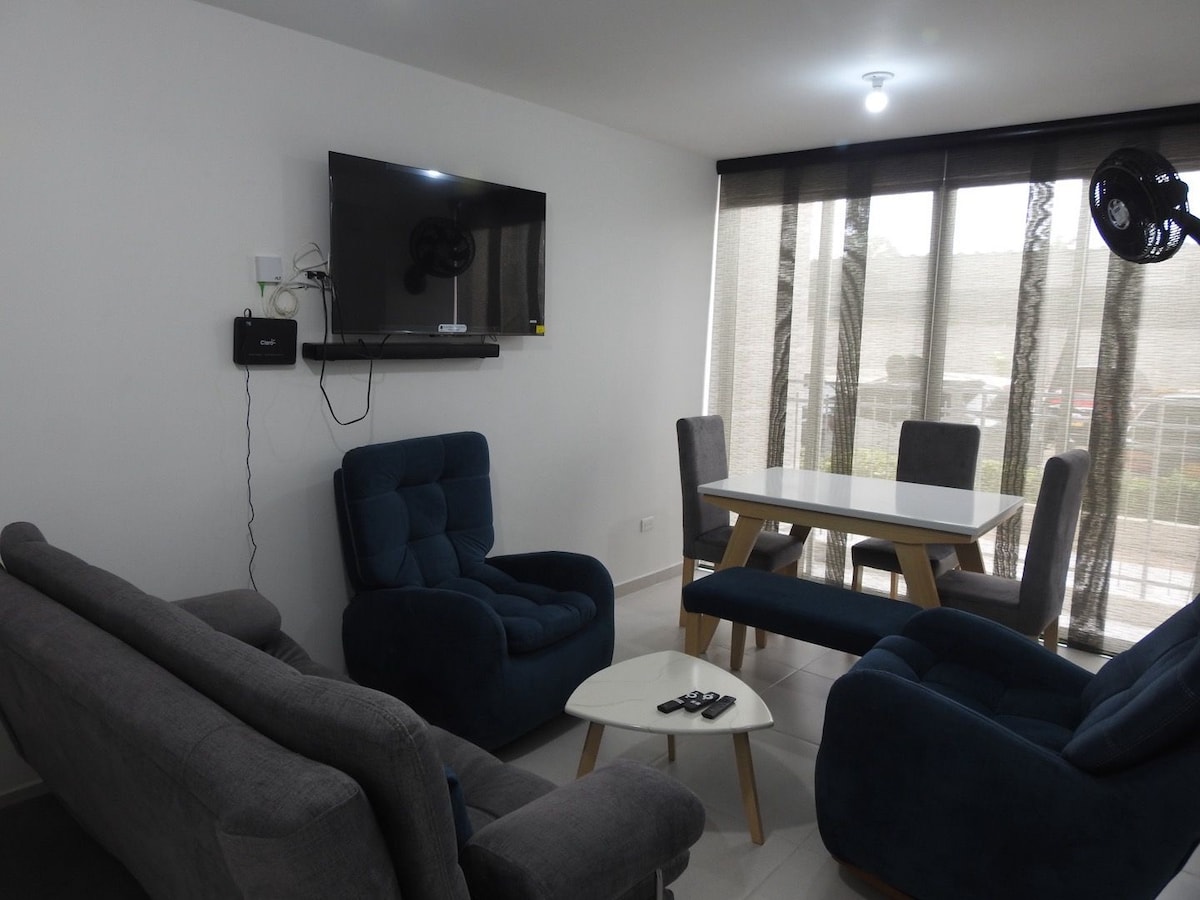 Apartamento moderno y cómodo, con cocina equipada, aire acondicionado y Wi-Fi rápido. Espacio seguro, tranquilo y céntrico, ideal para descansar o trabajar en Villavicencio. Dentro de la propiedad hay lugar para guardar moto sin costo adicional. Por norma del gobierno, solicitamos la foto de la cédula para el registro obligatorio de huéspedes. Centro comercial VIVA a menos de 1 km y tiendas o droguerías a 2 cuadras.Acceso rápido a transporte y servicios, entrada privada con cerradura inteligente