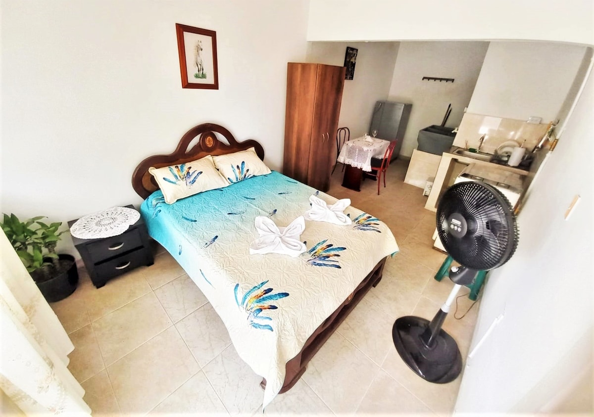 Lugar de descanso apto para dos personas, bien equipado, ideal para estancias largas. !!Ya cuenta con Aire Acondicionado!! Totalmente privado, todo en 1 solo espacio acogedor, con puerta directamente a la calle, fácil acceso. Cuenta Cocina, lavadero, Wifi, nevera, comedor, baño, suministro de agua las 24 horas (Reserva de 2.000L), en fin, lo necesario para una estancia placentera. Nota: Parqueadero gratuito!!