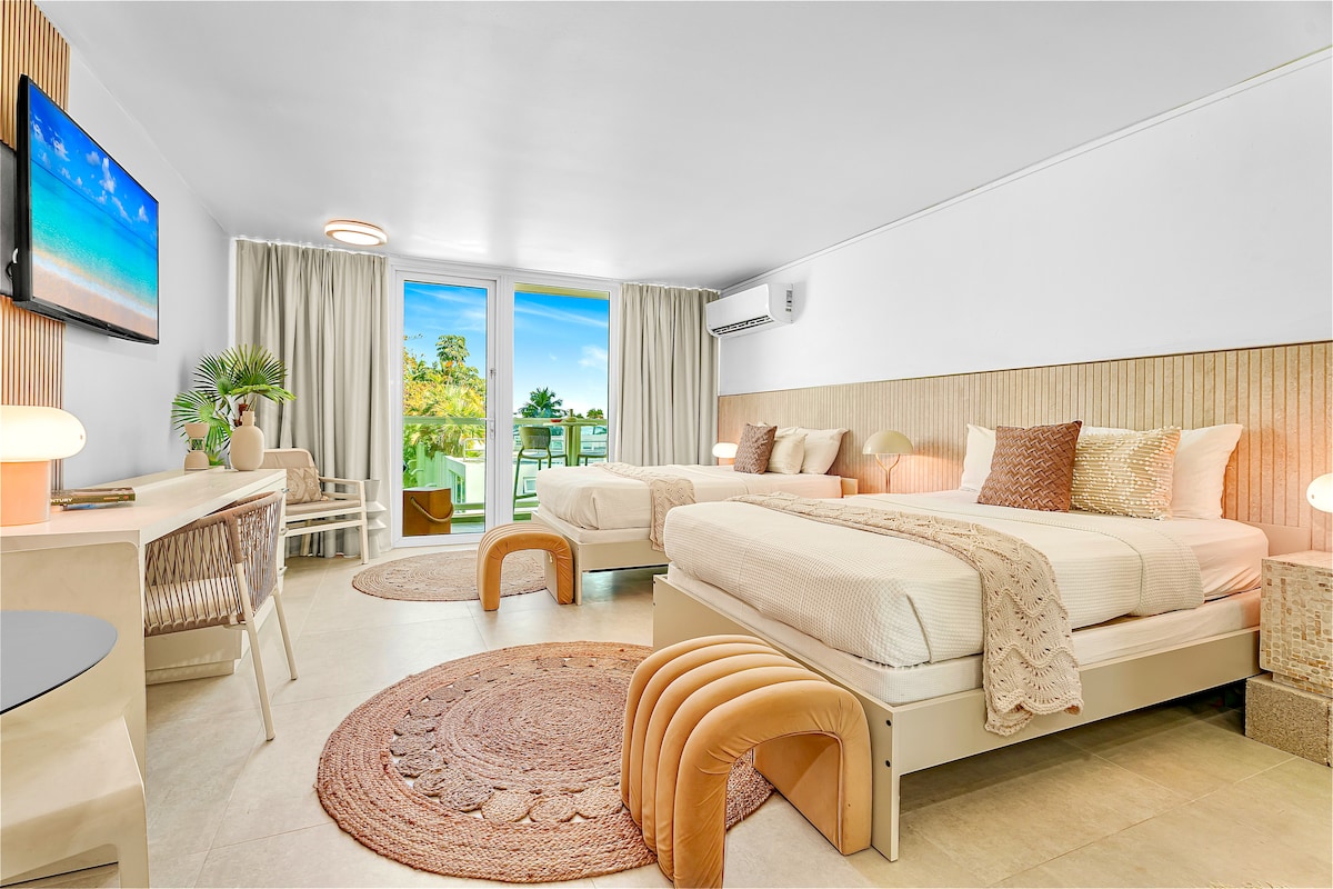 Welcome to Romeo Gay Hotel - San Juan’s boldest escape, made exclusively for the Gay community. The Romeo Quad Room offers 2 luxurious Queen beds, a modern design, A/C, fast Wi-Fi, and a TV. Whether you're visiting with friends or a romantic partner, this stylish room is your launchpad to explore the best of San Juan. Just a 15-minute walk from Condado Beach and close to bars, clubs, and dining hotspots. Enjoy access to a shared pool, kitchen, and 24/7 front desk. Sexy, social, & unforgettable.