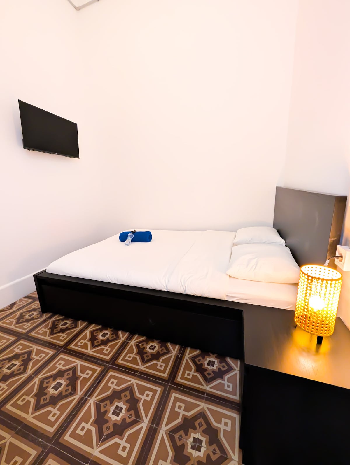 Habitación privada interior con baño privado, cuenta con televisor mesita de noche, grande y espaciosa una cama doble para que puedas dormir tranquilo, tienes zonas compartidas como la cocina, el coworking y la terraza para disfrutar de tu estadía.