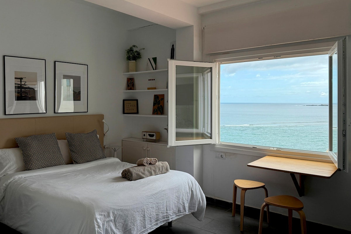 Nuevo estudio con impresionantes vistas a un paso de la Playa de Las Canteras. Pequeño pero completo y acogedor, y con muchas comodidades. La terraza es de uso privado y exclusivo de los huéspedes del estudio! La ocupación máxima es de 2 adultos, durmiendo en el cómodo sofá-cama, y por sus características, no es apto para personas con movilidad reducida o niños pequeños. Nuestros huéspedes podrán disfrutar de las vistas y del sonido de las olas. No hay mejor música para relajarse y descansar!