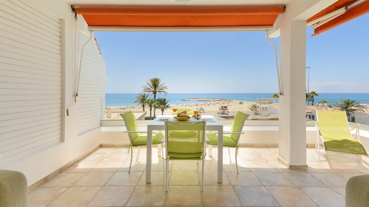 Apartment 100m2 with sea view and direct beach access in PLAYA DEL AGUILA. A corner of paradise with an exceptional climate all the year. Peaceful location that's ideal for families and romantic getaways. Come and recharge to the fullest! Large living room with full equipped kitchen and sofa bed for two people 1 bedroom suite with complete bathroom 1 double bedroom with 2 beds 1 bathroom with shower 2 terraces with ocean view All common areas as swimming pool and deck chairs have free access.