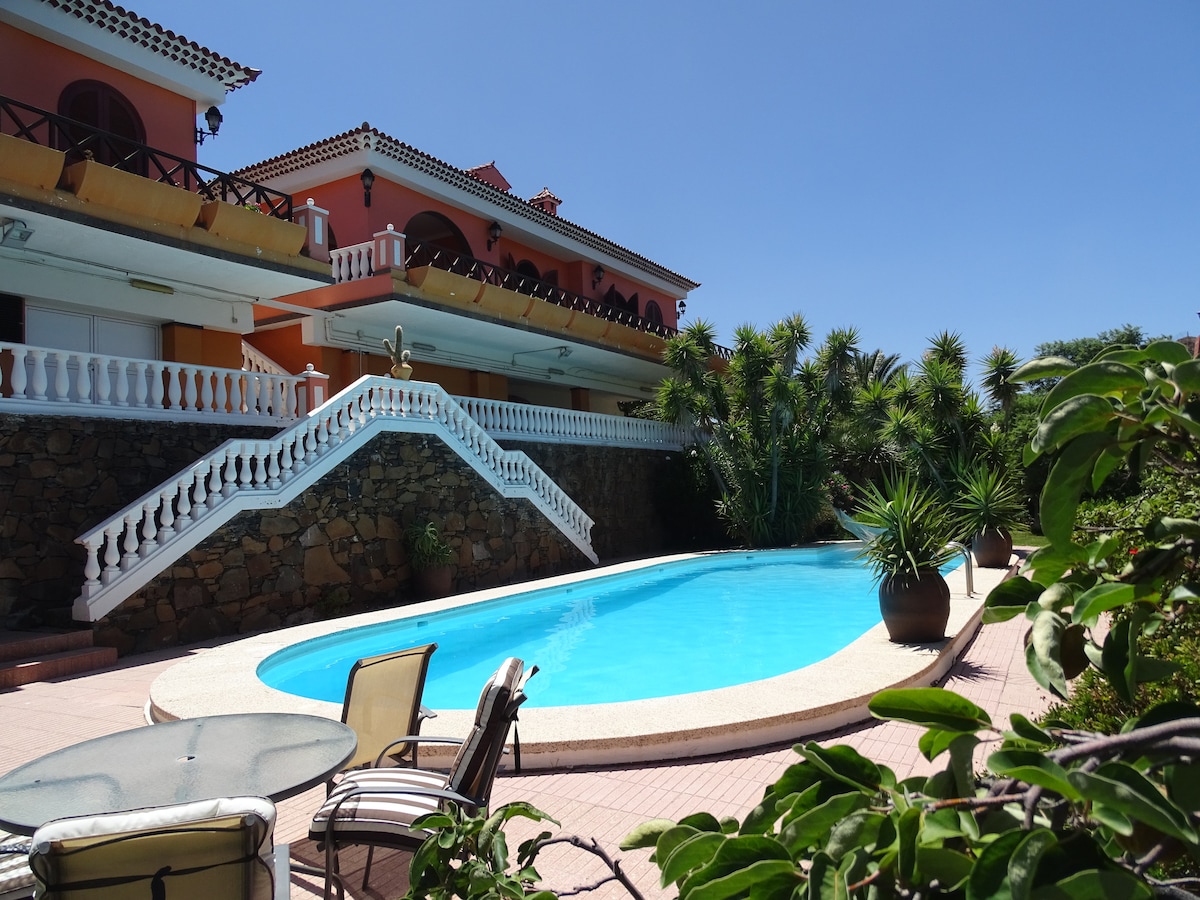 La villa , adults only,se encuentra en una colina privada así que las vistas al mar son inmejorables.Tiene piscina privada de uso exclusivo .Las playas están a 6/7 minutos de coche y en Las inmediaciones hay un campo de golf.En el interior de la finca hay varias plantas olivos y otras edificaciones independientes .Es muy difícil encontrar un sitio igual cerca de la costa y de las playas más conocidas de Gran Canaria.El entorno es rural. La propiedad es tranquila .