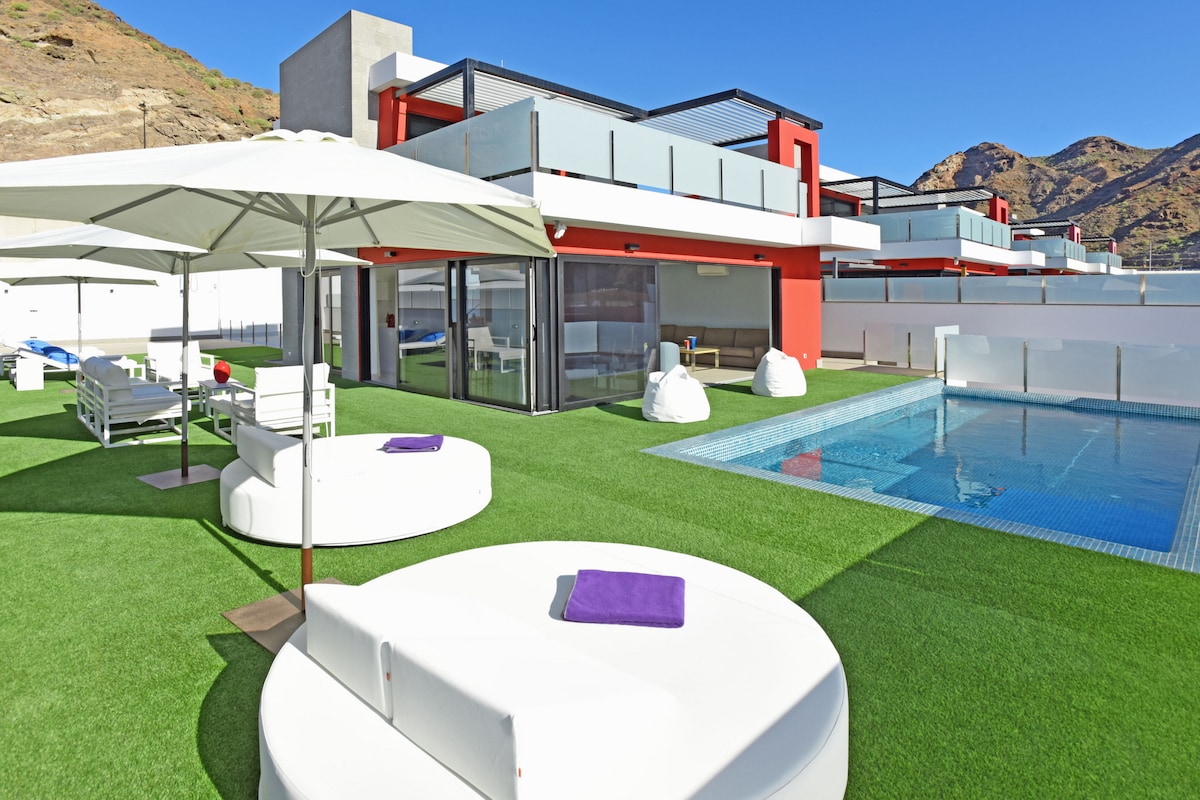 Lovely and high quality villa in the sunny area close to the famous Amadores beach or Anfi Golf! The Villa is designed to high standards, with a fully equipped kitchen, 2 lounges, 4 bedrooms, 4 bathrooms, generous courtyard terrace, bbq area, botanical garden / heated swimming pool. Is a private place, where comfort is valued. Family-oriented, kids will love the pool area. Youll be 5 minutes away from the best beaches, the newest mall in GC.