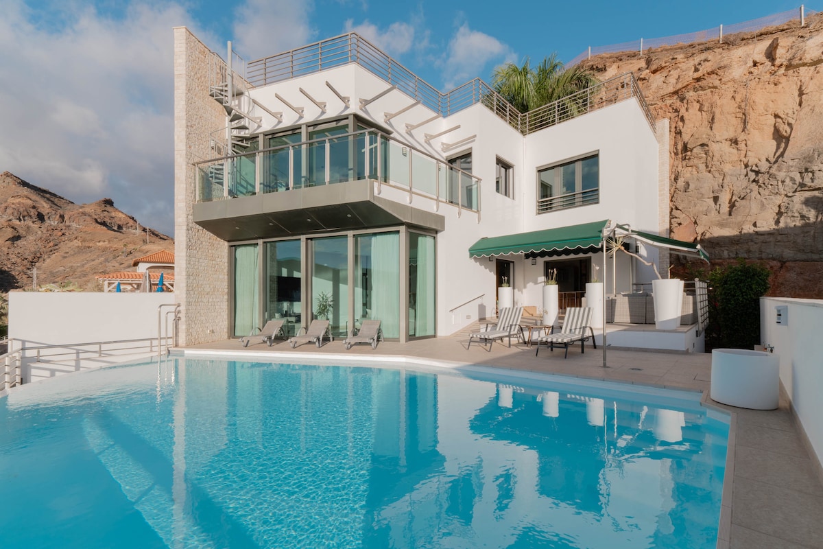 Preciosa villa privada con piscina climatizada. Villa de nueva construcción, de alta calidad y totalmente equipada. Es tu casa perfecta para unas soleadas y tranquilas vacaciones con vistas a las montañas, en el suroeste de la isla. Amplia y moderna, con grandes terrazas, la villa se encuentra ubicada en una zona tranquila de la urbanización de Tauro, en el municipio de Mogán. A menos de 1 km de los campos de golf Anfi Tauro, 5' de Amadores, a 2.2 km de la playa de Tauro y a 15' de Maspalomas.