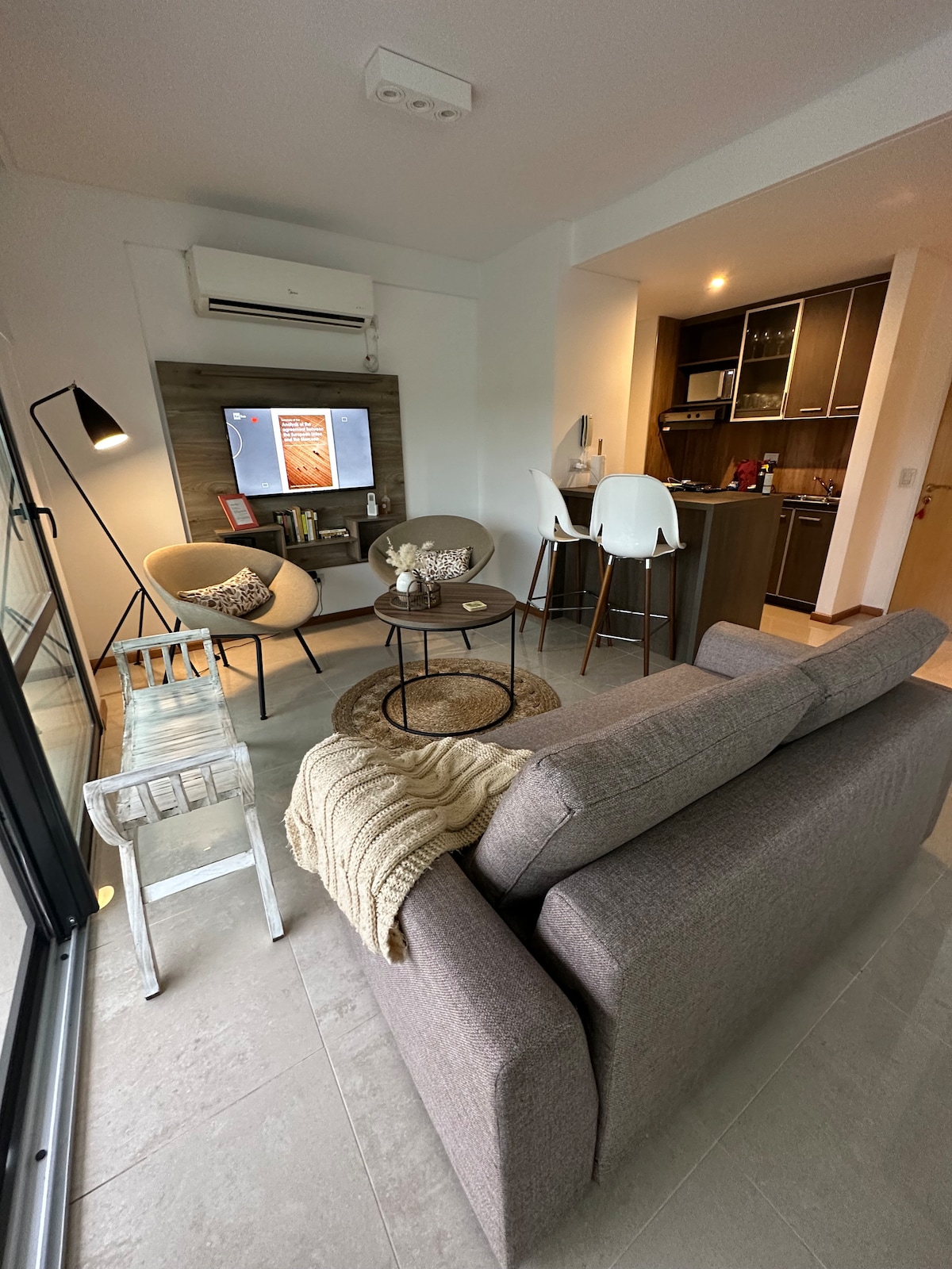 Este amplio y luminoso Loft se encuentra en una ubicación estratégica, con acceso a pie a shoppings, restaurantes, cines y más. El complejo tiene seguridad 24hs. Su decoración con tonos suaves, crea un ambiente único y confortable. Cuenta con una cocina abierta completa, moderna y funcional. Este es depto perfecto para quienes buscan un alojamiento con todo lo necesario para una estadía agradable donde combinar placer y trabajo.
