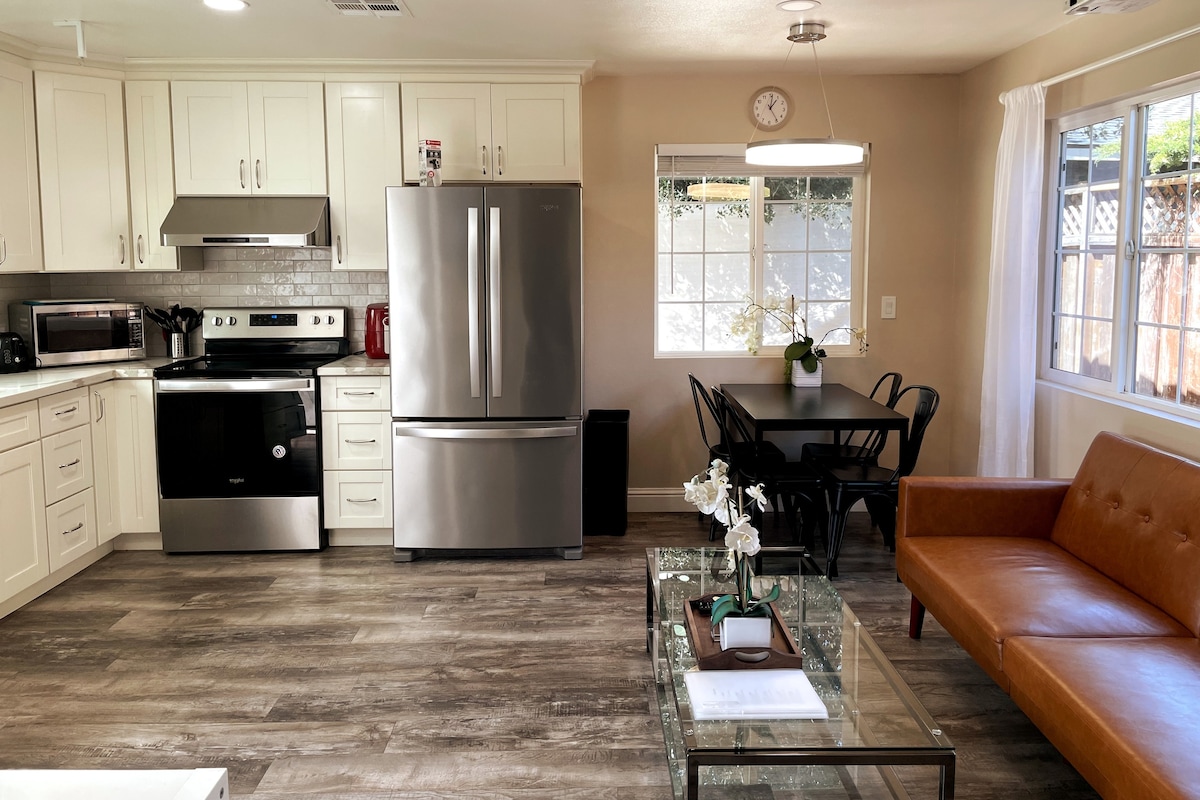 Newly renovated ultra clean designer home in duplex minutes from Apple campus. Highly walkable, the entire home has been recently rebuilt from the studs with new top of the line designer furnishings, kitchen essentials, appliances, and toiletries. Disney+, Hulu, Cable TV, and Nespresso coffee included during stay with ultra-fast internet up to 500mbps. 5 min to Whole Foods 12 min to Apple Park 20 min to Stanford