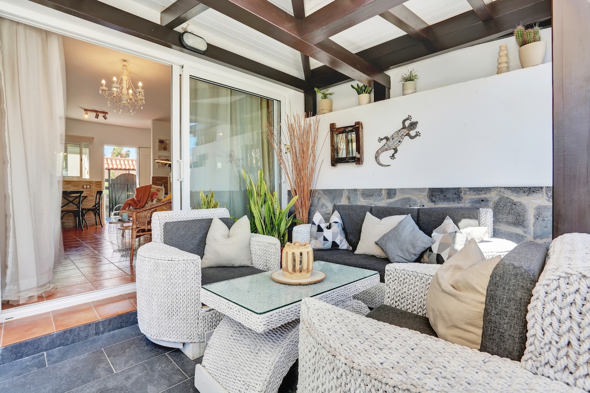 Comfortable and elegant Bungalow next to the International Golf Course of MASPALOMAS and Tenis-Padel Center. It has just been renovated and has all the amenities for the enjoyment of our guests. The bungalow can comfortably accommodate 4 people in completely separate bedrooms. It has a total of 50m2 with a private garden at the entrance. The terrace has a private atmosphere, with a decoration and illumination very cozy and romantic to spend special nights.