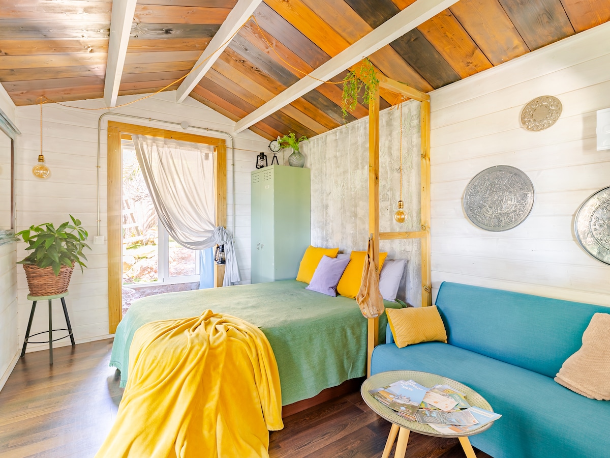 Estudio con cama alta desde donde ver el mar y el horizonte, cocina bien equipada, baño completo con plato de ducha, salón comedor y terraza desde donde disfrutar de unas vistas panorámicas del mar. Dispone de hamacas, una plancha eléctrica, fregadero, ducha exterior, bañera ... podrás cocinar y comer disfrutando de las vistas. Por las tardes no hay nada mejor que relajarse con una copa de vino viendo los atardeceres y las noches estrelladas en la bañera.